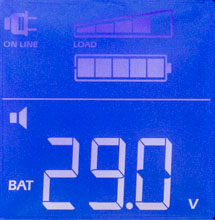 - цифровые значения для величины и частоты входного и выходного напряжений, мощности нагрузки (в вольт-амперах и в процентах от максимума), уровня заряда батареи и ожидаемого при текущем потреблении времени автономной работы, напряжения на батарее и температуры внутри корпуса,