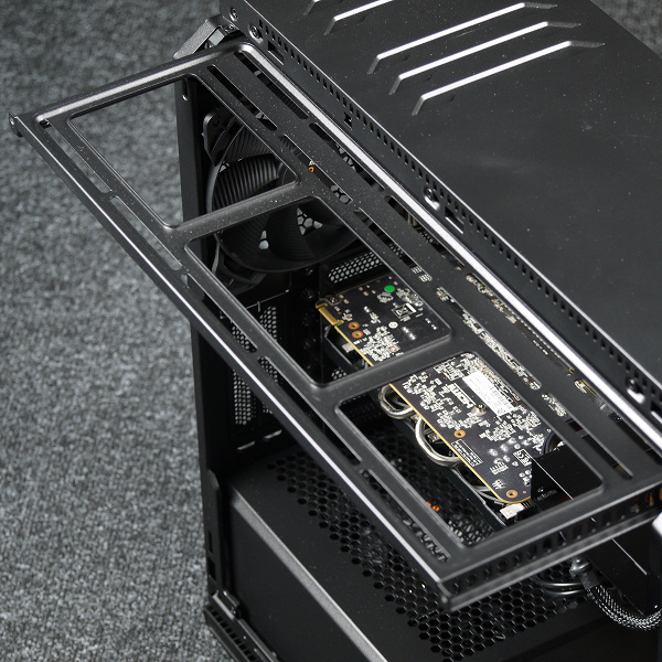 Если спереди и сзади вентиляторы устанавливаются вполне привычно, то сверху для элементов системы охлаждения предусмотрен съемный кронштейн, который размещается под верхней стенкой корпуса и фиксируется винтами.