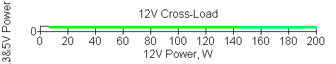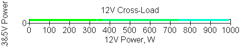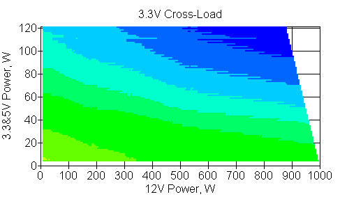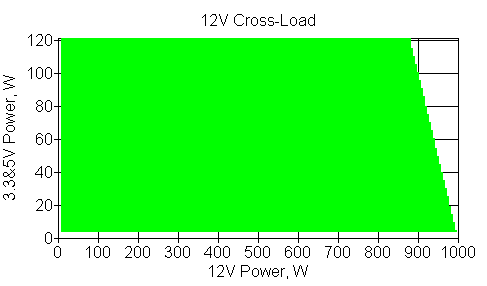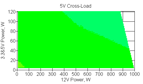Следующим этапом инструментального тестирования является построение кросснагрузочной характеристики (КНХ) и представление ее на четвертьплоскости, ограниченной максимальной мощностью по шине 3,3&5 В с одной стороны (по оси ординат) и максимальной мощностью по шине 12 В с другой (по оси абсцисс). В каждой точке измеренное значение напряжения обозначается цветовым маркером в зависимости от отклонения от номинального значения.