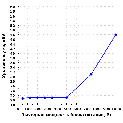 При работе в диапазоне до 500 Вт включительно шум блока питания находится на минимально заметном уровне — в пределах 23 дБА с расстояния 0,35 метра. Работающий вентилятор в данных режимах не ухудшит общую акустическую эргономику компьютера даже ночью.