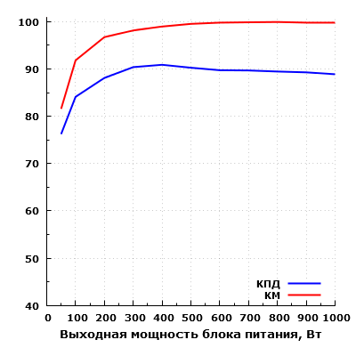 Эффективность БП находится на достойном уровне. Согласно нашим измерениям, КПД данного блока питания достигает значения свыше 88% в диапазоне мощности от 200 до 1000 ватт, а в диапазоне от 300 до 500 Вт превышает 90%. Максимальное зарегистрированное значение составило 90,9% на мощности 400 Вт. Одновременно с этим, КПД на мощности 50 Вт составил 76%.