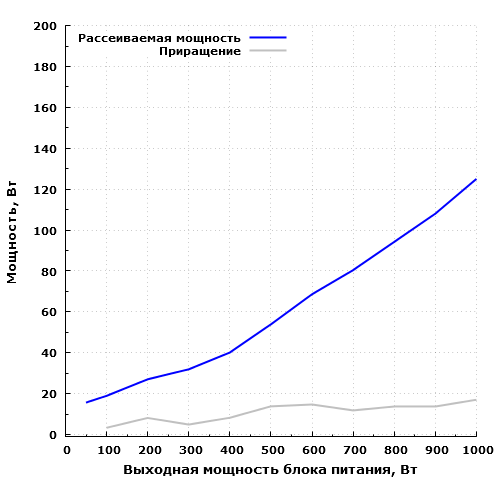 Экономичность модели находится на очень хорошем уровне: на максимальной мощности БП рассеивает около 125 Вт, 60 Вт он рассеивает на мощности порядка 540 Вт, а 100 Вт — на мощности около 830 Вт. На мощности 50 Вт блок питания рассеивает около 15,6 Вт.