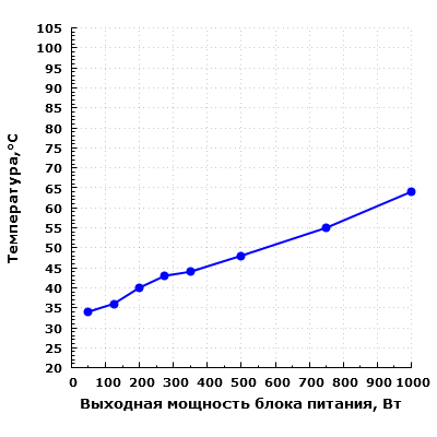 В данном случае термонагруженность блока питания находится на невысоком уровне в диапазоне до 750 Вт включительно, а при работе на максимальной мощности термонагруженность можно считать удовлетворительной.