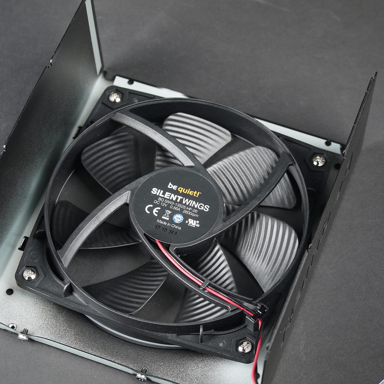 В блоке питания установлен вентилятор be quiet! Silent Wings 3 (BQ SIW3-13525-HF-26) типоразмера 135 мм, основанный, по заявлению производителя, на гидродинамическом подшипнике. Вентилятор имеет двухпроводное подключение. Скорость его вращения составляет 2600 оборотов в минуту при номинальном питании 12 вольт.