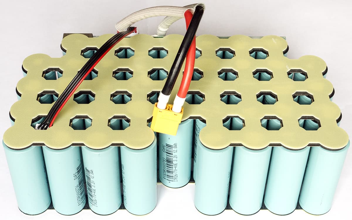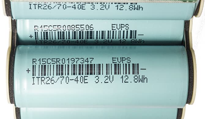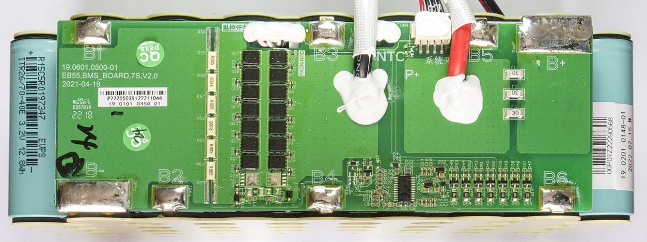 Батарея состоит из 42 аккумуляторов ITR26/70-40E с размерностью 26700, напряжением 3,2 В (номинальное для LiFePO4) и емкостью 12,8 Вт·ч / 4000 мА·ч. Подобные выпускаются разными производителями, определить происхождение по имеющейся маркировке не удалось.