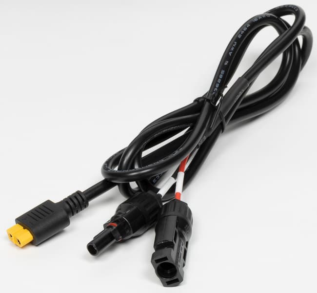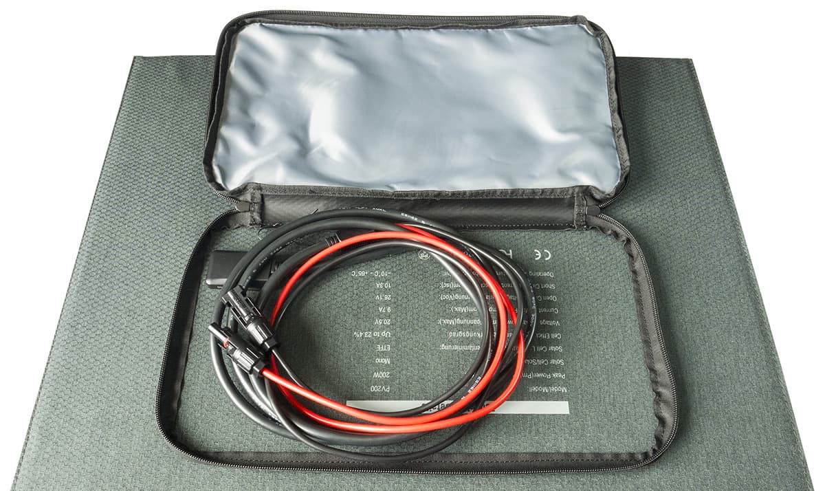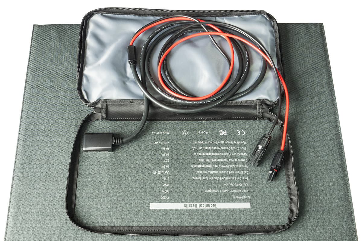 В комплекте внешний блок питания от сети переменного тока со сменным входным шнуром, кабели для подключения к автомобильному прикуривателю (длина 70 см, сечение 16AWG, или 1,3 мм², колодка содержит сменный предохранитель на 15 А) и к солнечной панели (сечение такое же, длина 1,5 м), а также набор печатной документации.