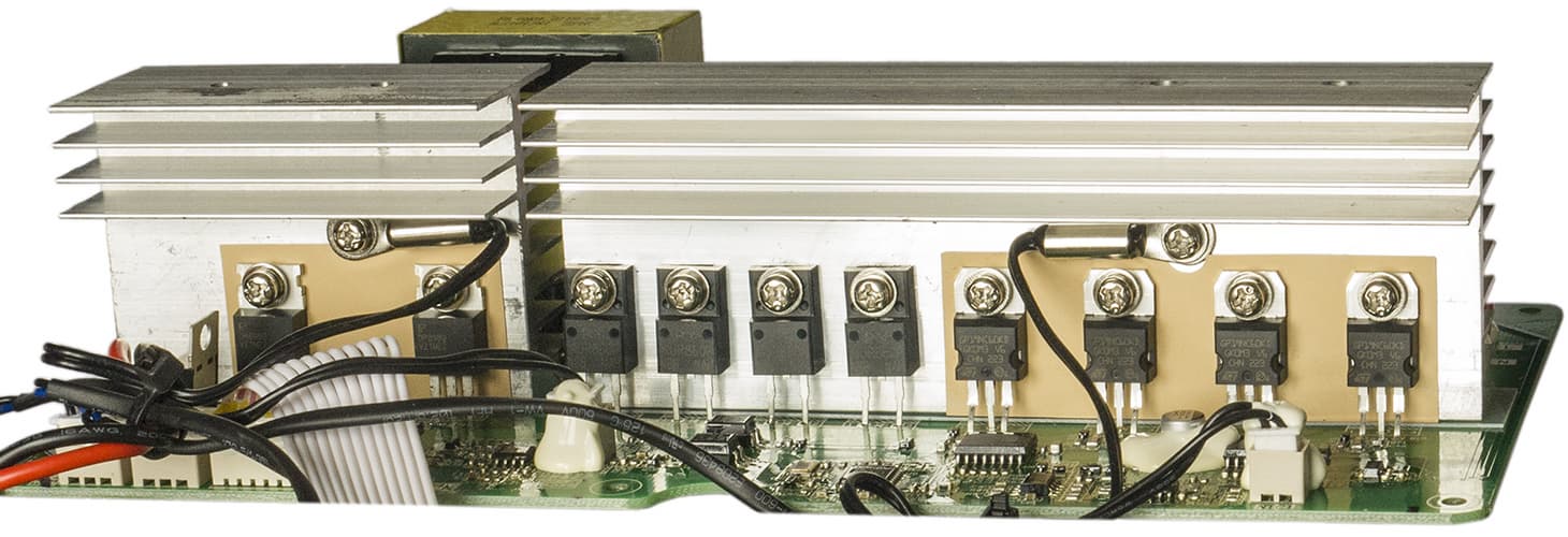 Мощные транзисторы установлены на двух ребристых радиаторах, к каждому из которых прикреплен термодатчик.