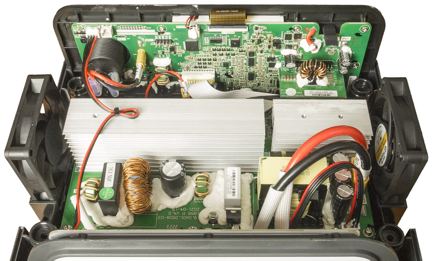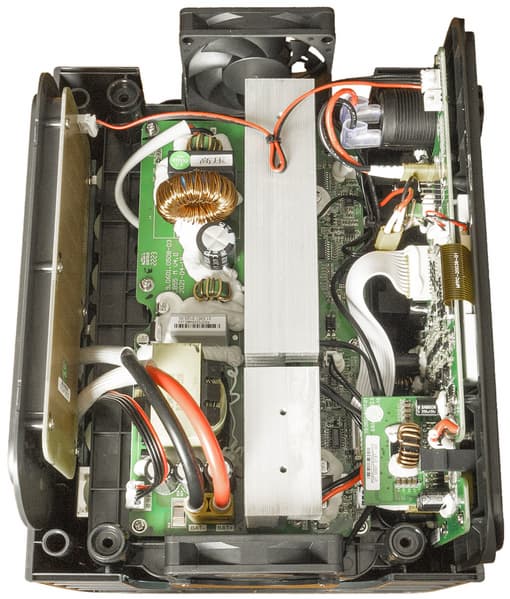 Горизонтально расположена плата с силовой электроникой, по бокам еще две платы — панель со светодиодами и низковольтная часть с цепями управления и индикации.