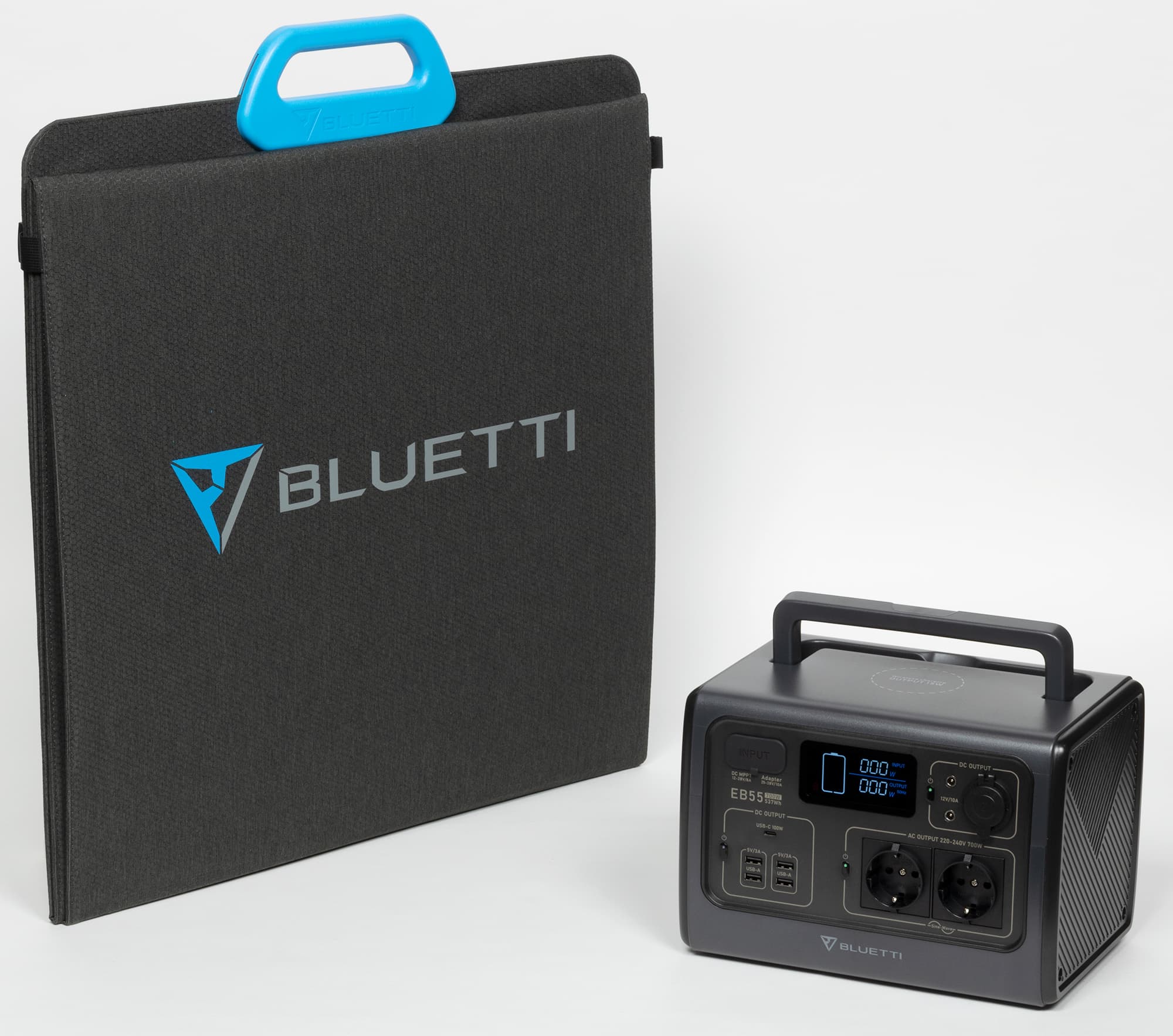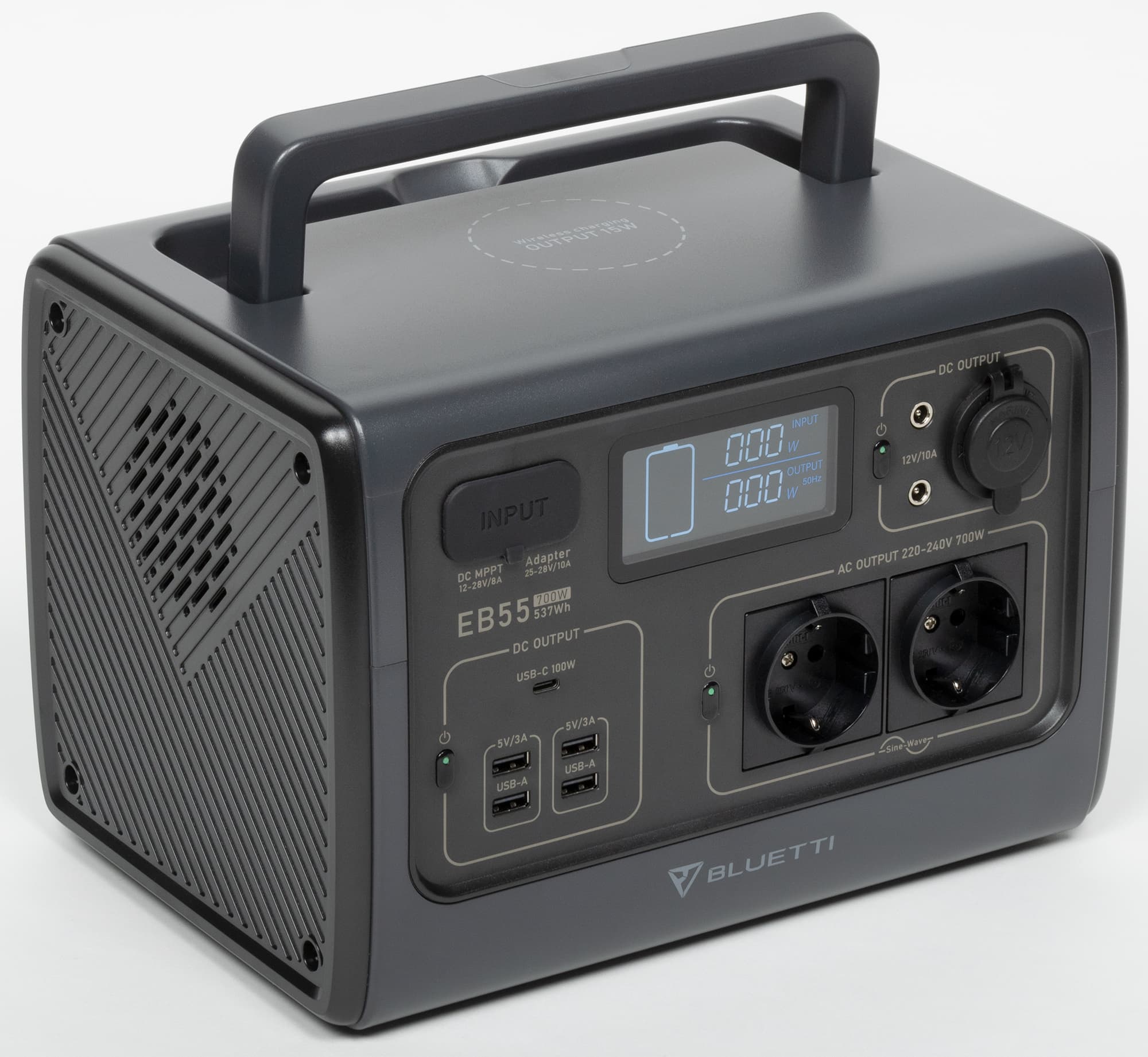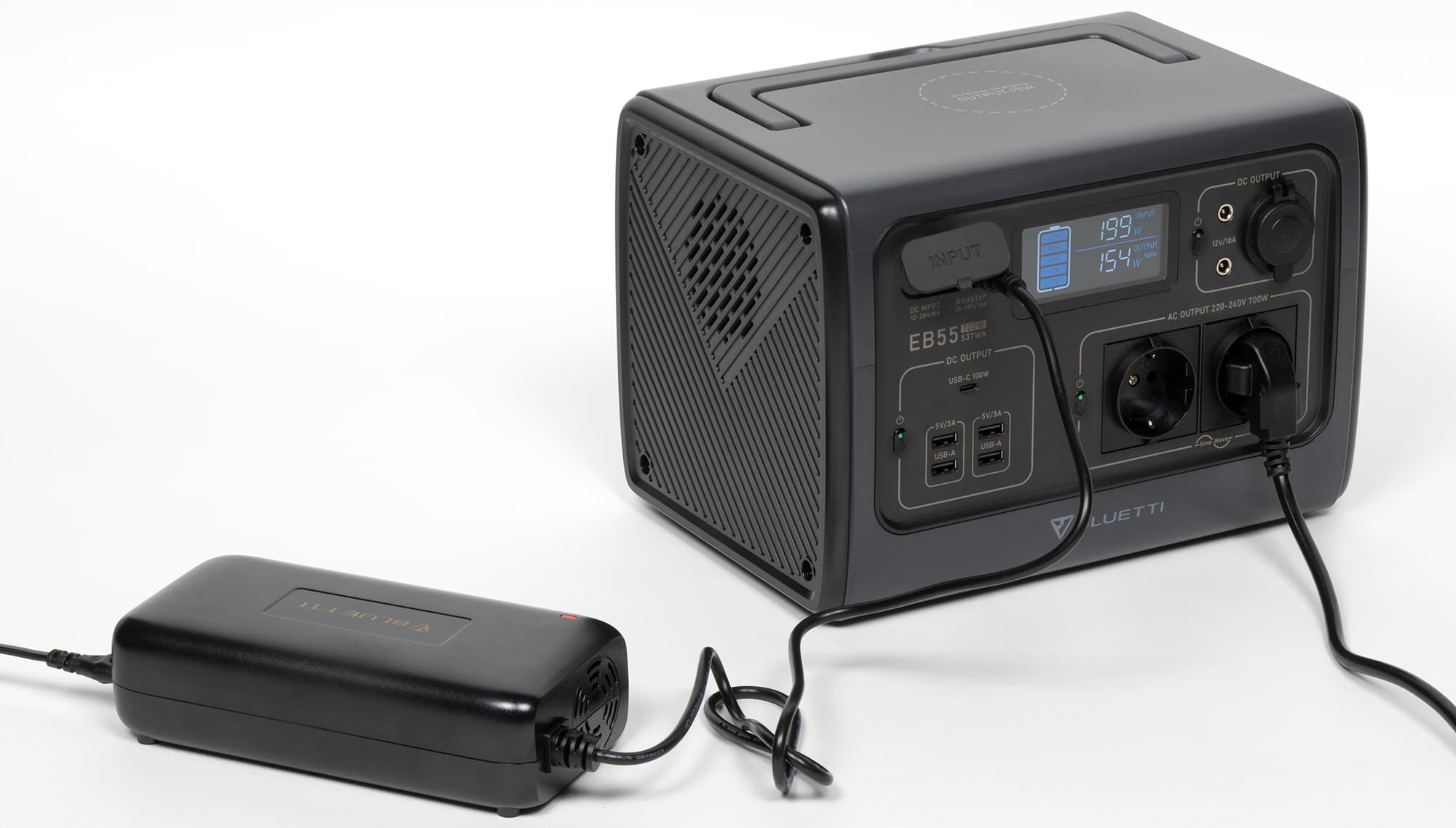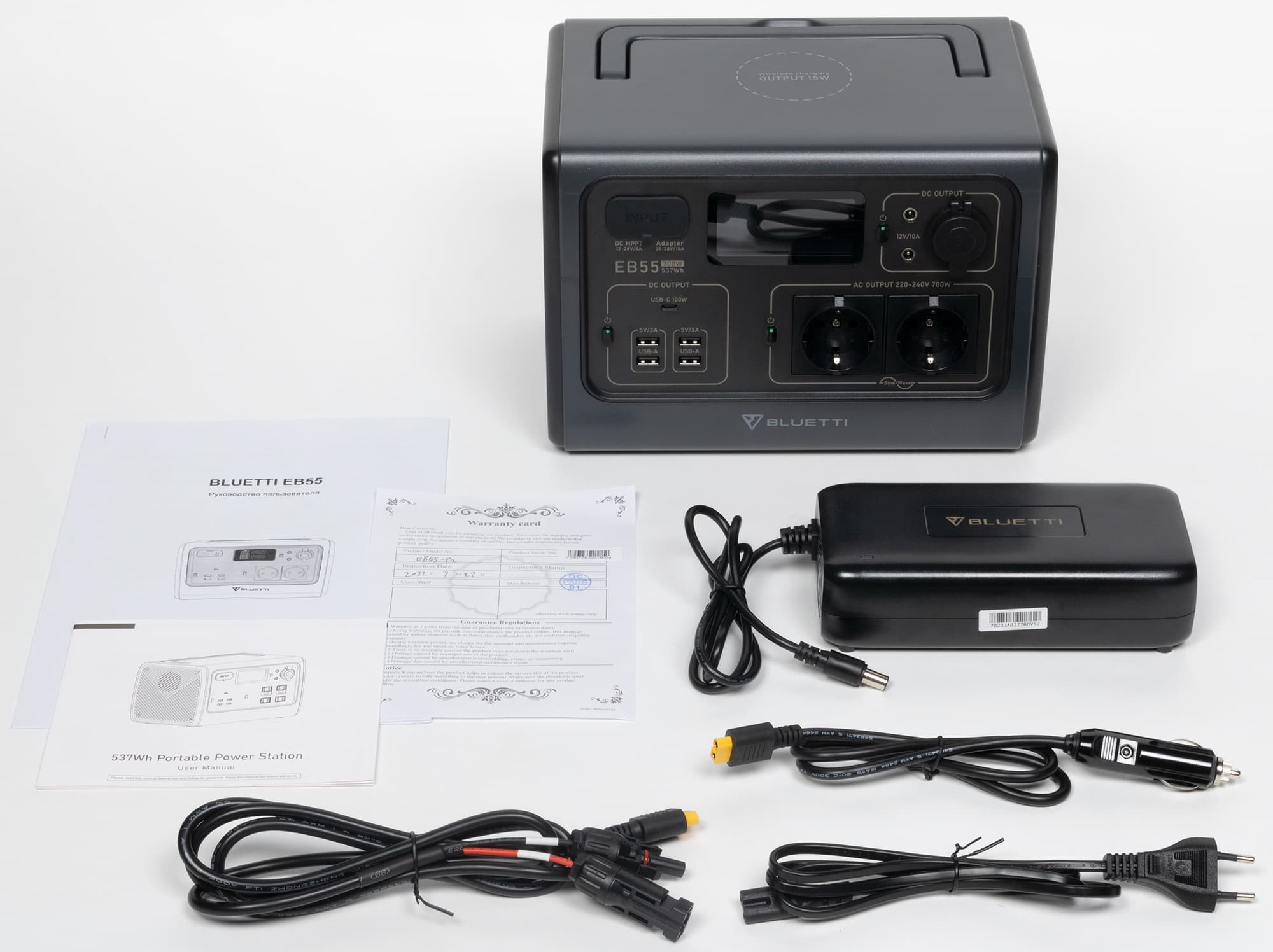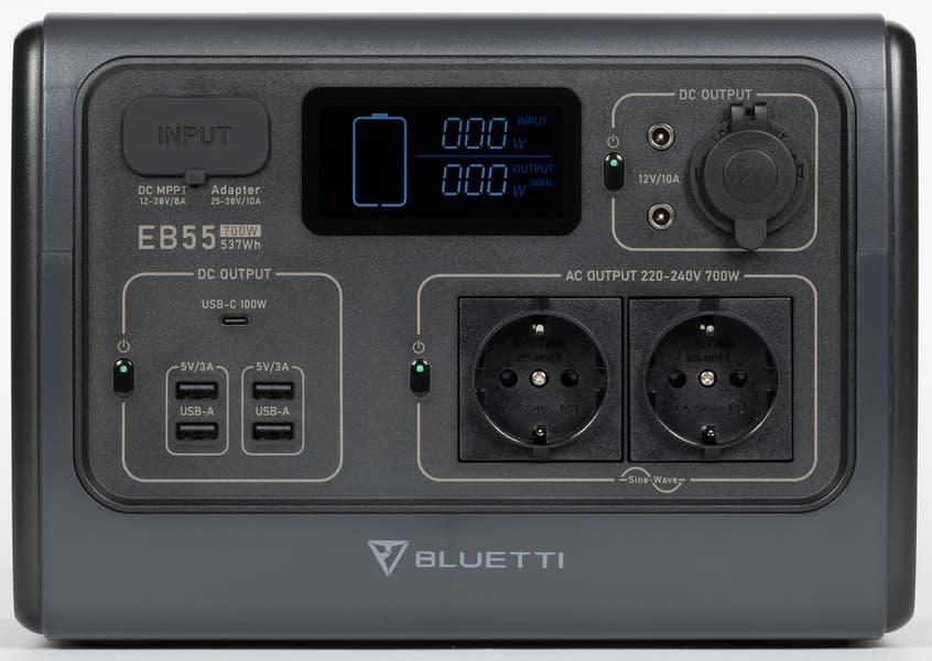 Мы рассмотрим один из наиболее компактных образцов — электростанцию Bluetti EB55 с максимальной мощностью 700 Вт (АС), батареей 537 Вт·ч и весом 7,5 кг. Российскому потребителю предлагается также более мощная модель Bluetti EB70 (1000 Вт, 716 Вт·ч, 9,7 кг).