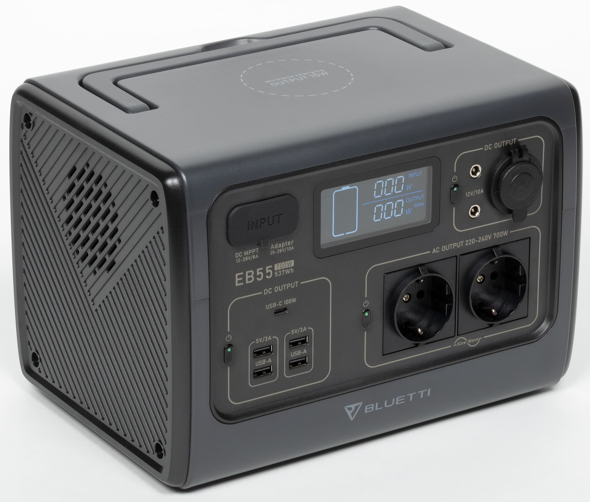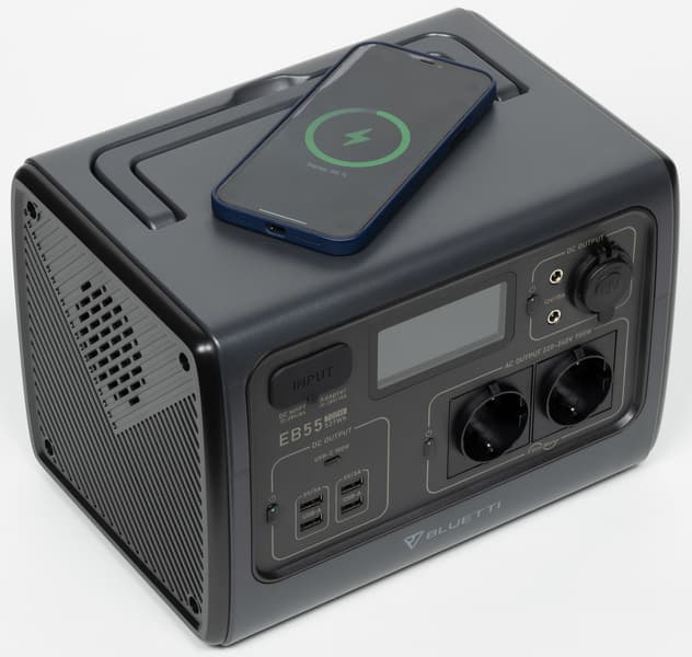 Bluetti EB55 — богатое по функциональности устройство батарейного питания: у него есть выходы переменного тока, порты USB-A и USB-C с поддержкой современных технологий и режимов заряда мобильных устройств, гнездо автомобильного прикуривателя и разъемы под штырьковый коннектор с напряжением 12 В. Предусмотрена беспроводная зарядка мобильных гаджетов, есть встроенный светодиодный светильник.