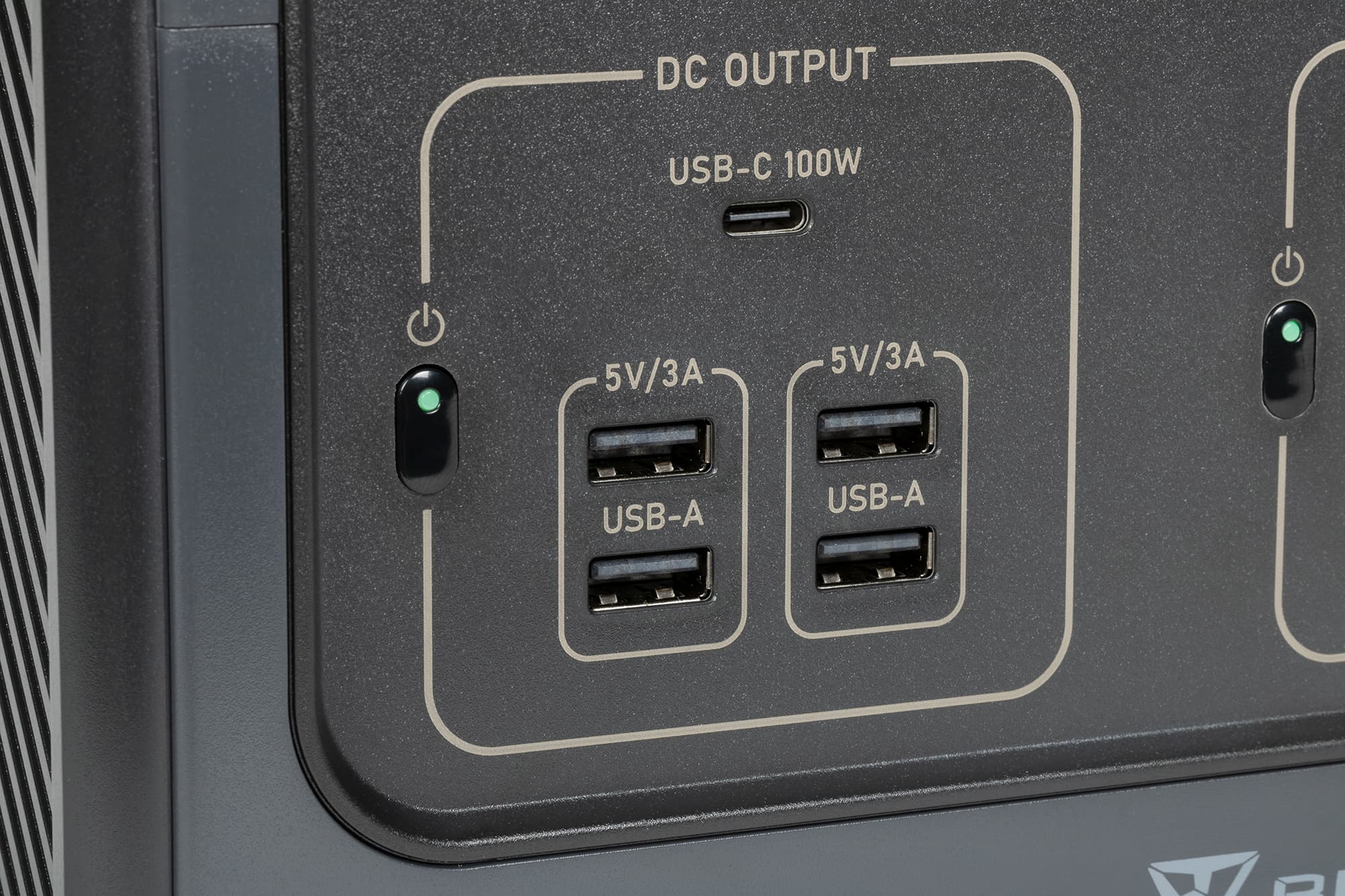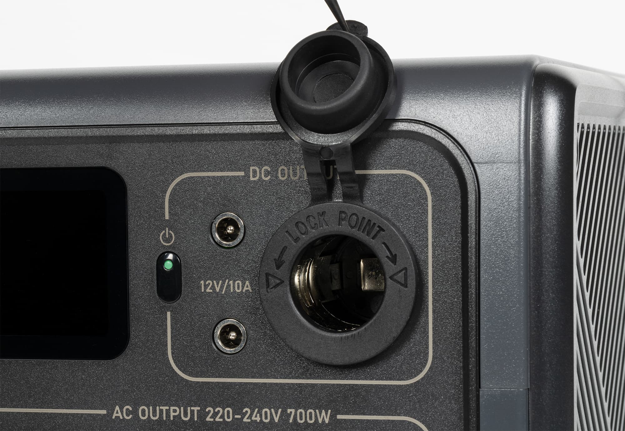 На одной из боковых поверхностей, которую можно считать лицевой панелью, находятся цветной ЖК-индикатор с диагональю 78 мм (по нашему замеру), набор портов USB — две пары Type-A и один Type-C, три 12-вольтовых выхода — два штырьковых под коннекторы DC5521 и гнездо как у автомобильного прикуривателя (закрыто резиновой крышечкой), а также две розетки CEE 7/4 Schuko с защитными шторками для подключения устройств с питанием от 230 В переменного тока (для регионов с другими стандартами предусмотрены соответствующие варианты). Каждая группа выходов подключается-отключается отдельной кнопкой со встроенным индикатором.