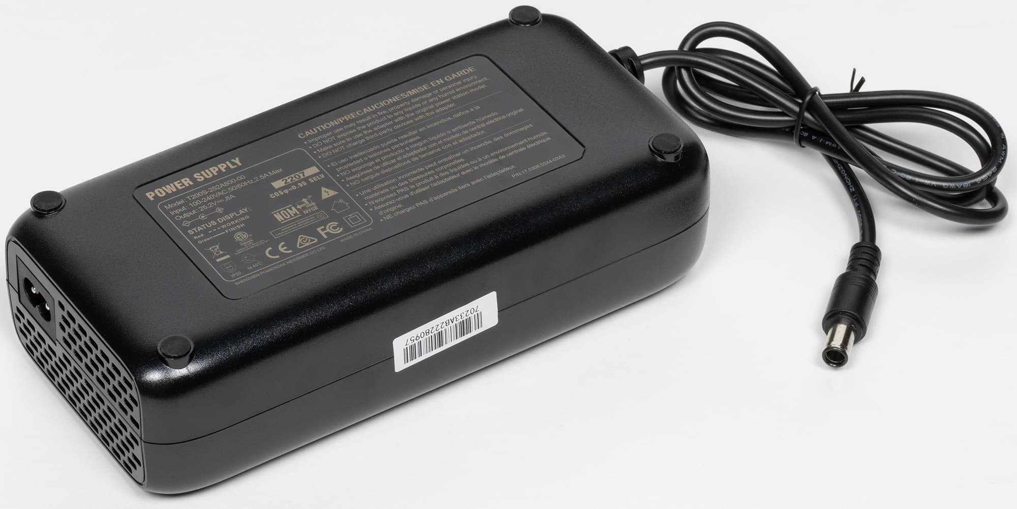 Сначала немного о штатном адаптере: входные и выходные параметры приведены выше в таблице, размеры 190×96×54 мм, вес с проводами 0,91 кг, съемный входной кабель имеет длину 1,1 м, выходной распаян, его длина 0,9 м, к станции подключается коннектором DC7909.
