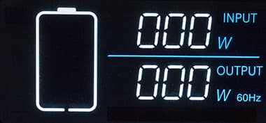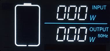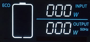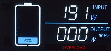 - крупными цифрами — энергопотребление по входу и на выходе в ваттах (три знака, для выхода указывается и частота АС), при перегрузке ниже появляется надпись Overload.