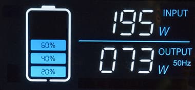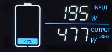 Без нагрузки на выходах AC при работе от батареи напряжение составляет 230-231 В; действующие стандарты допускают отклонение в 10%, то есть «законным» является диапазон 207—253 В.