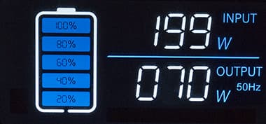 | Нагрузка, Вт | Время работы от батарей, часов:минут | Оценка мощности на ЖК-экране, Вт | Наибольший нагрев | Включение вентиляторов |