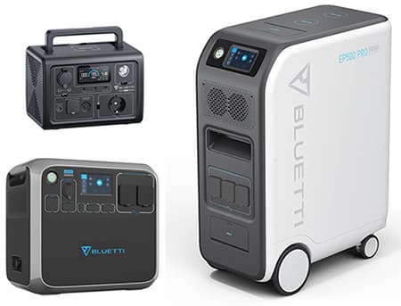 Торговая марка Bluetti — это ряд различных устройств батарейного питания, часть из которых достаточно портативны, их можно отнести к кемпинговым электростанциям, но есть и гораздо более габаритные, с весом, превышающим 80 кг, а потому оснащенные приличного размера колесами.