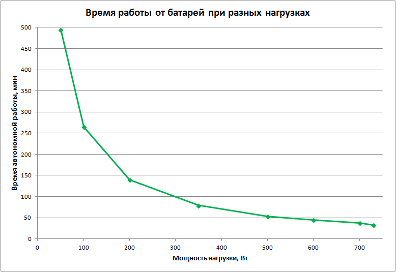 Мы измерили время автономной работы в диапазоне нагрузок (активных — без реактивных составляющих, задавались с точностью ±5%), результаты сначала представляем в виде графика: