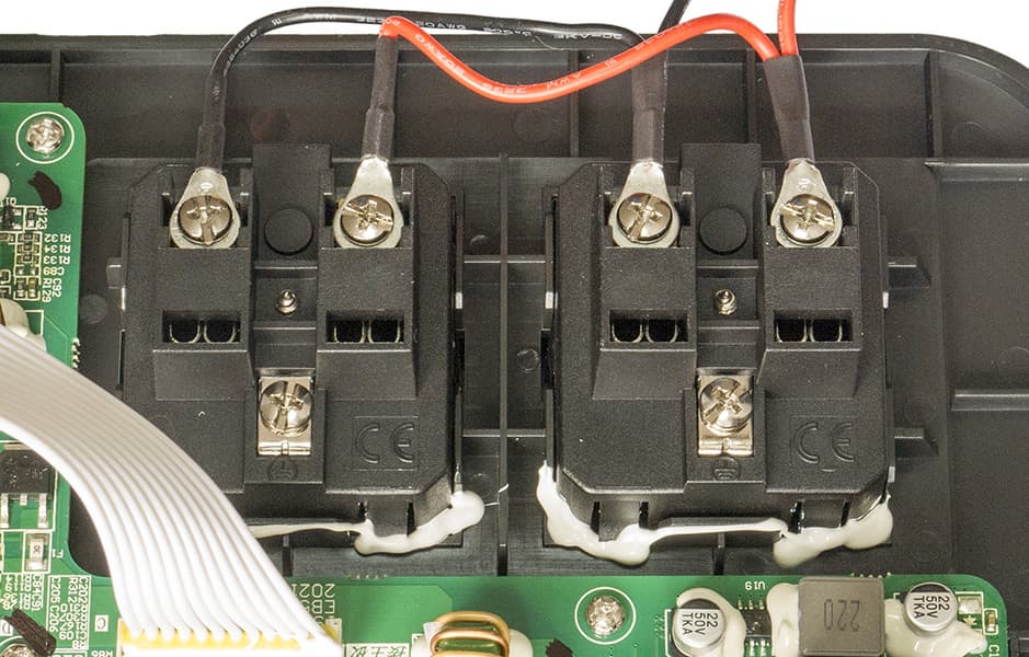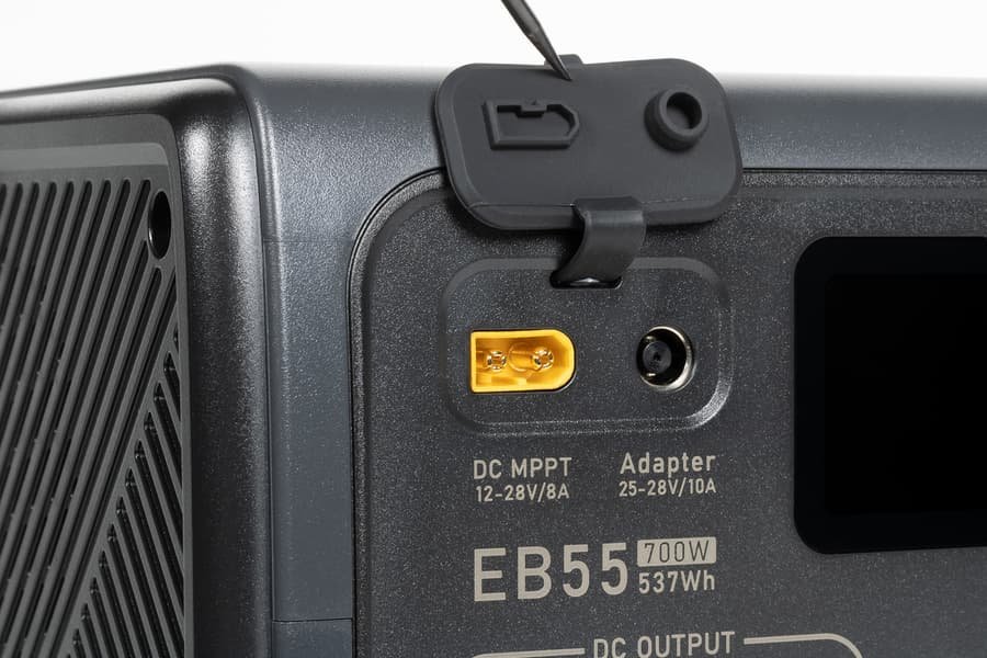 Под еще одной крышечкой расположены входы — правый под цилиндрический разъем штатного БП, левый двухконтактный XT60 для подключения к бортсети автомобиля или к солнечной панели. При этом можно задействовать оба входа сразу, чтобы ускорить заряд; упоминается возможность использовать с той же целью два блока питания, один из которых из комплекта, а второй надо купить дополнительно, причем вместе с переходником, чтобы подключать ко входу ХТ60.