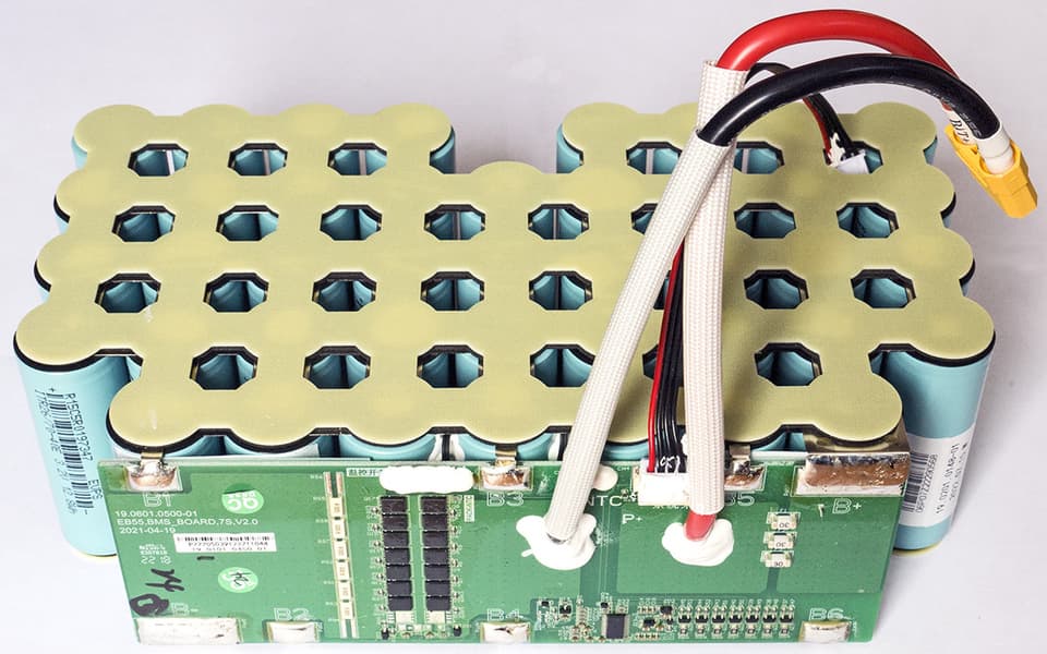 Аккумуляторные ячейки соединены последовательно по 7 штук, шесть таких пакетов соединяются параллельно для увеличения предельного рабочего тока.