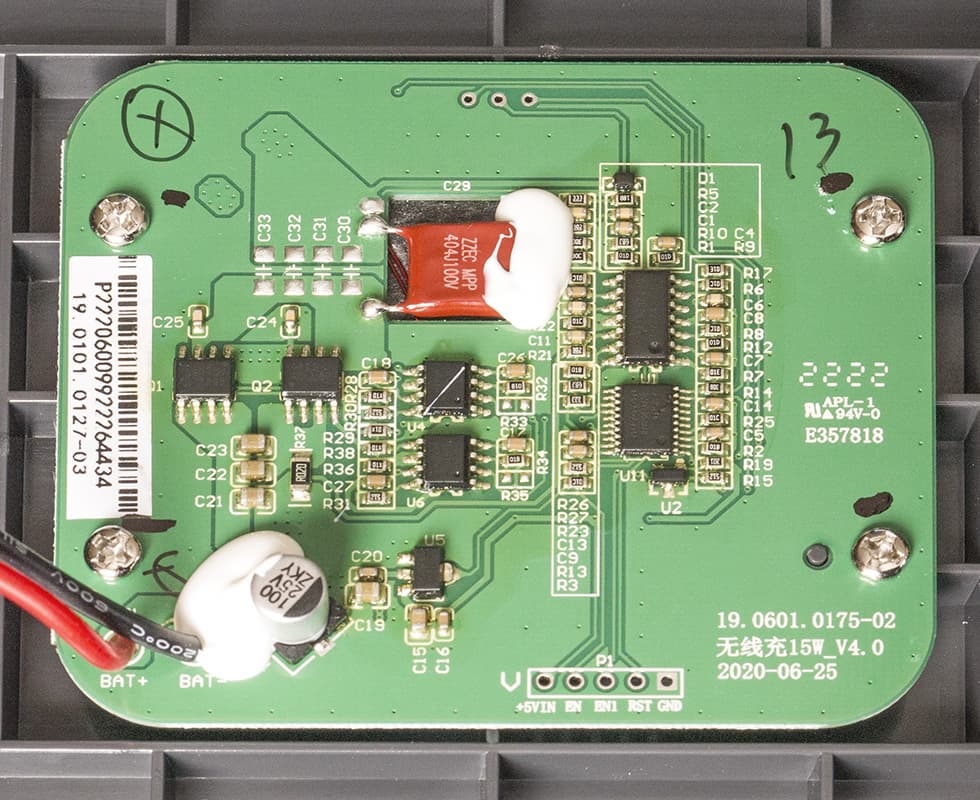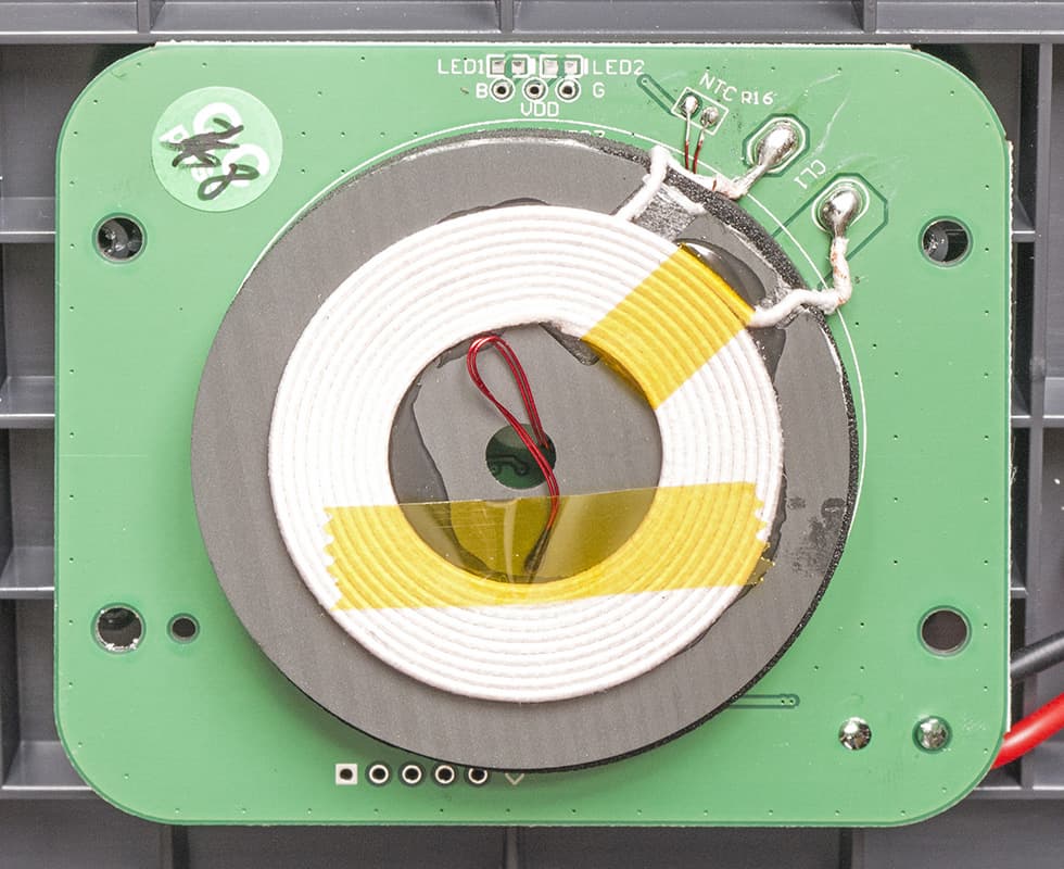 Беспроводное зарядное устройство содержит катушку с внешним диаметром 38 мм и внутренним 20 мм, возможный перегрев отслеживается термодатчиком.