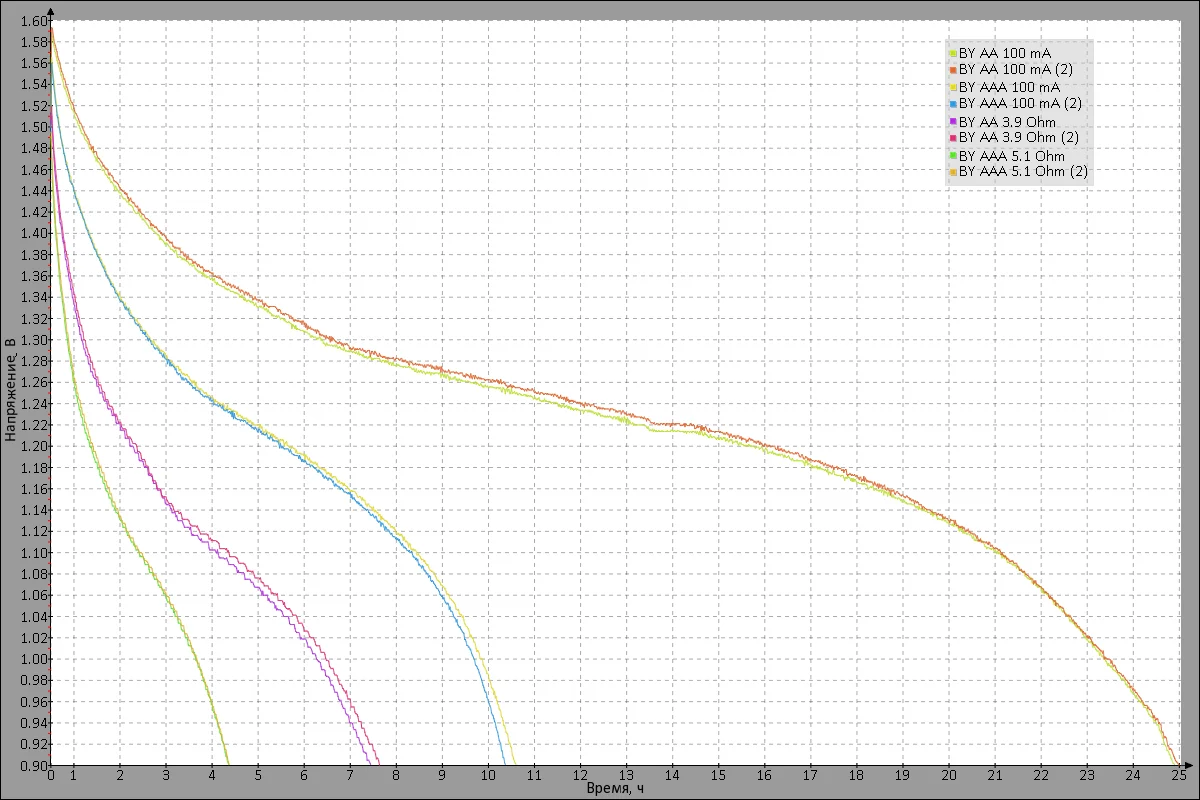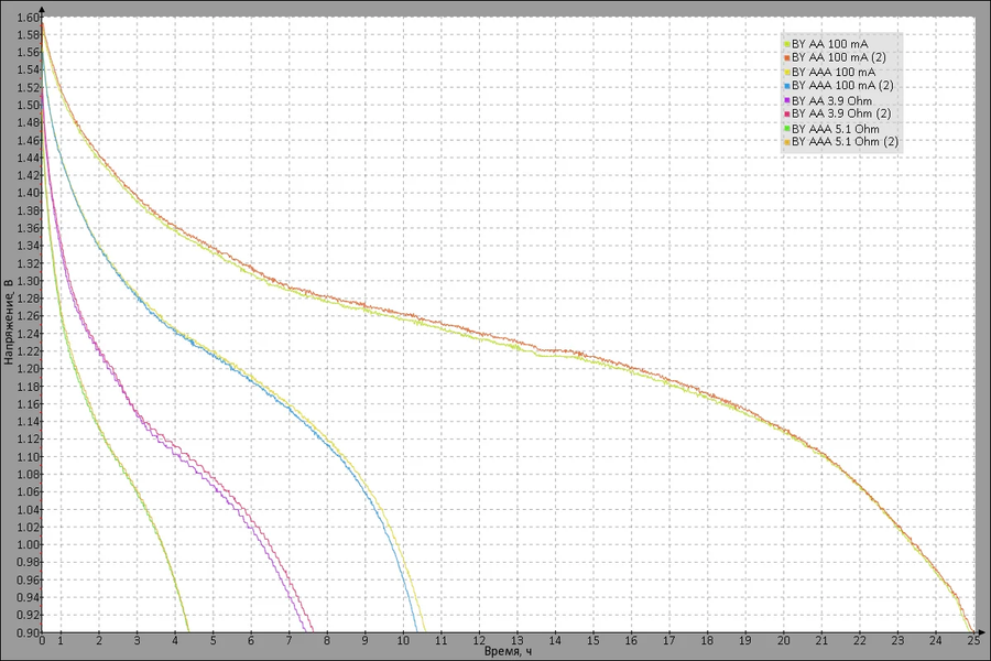Самый длинный тест (разряд батареек AA током 100 мА) занял больше суток. На графике можно посмотреть, как менялось напряжение на батарейках в процессе разряда во всех режимах.