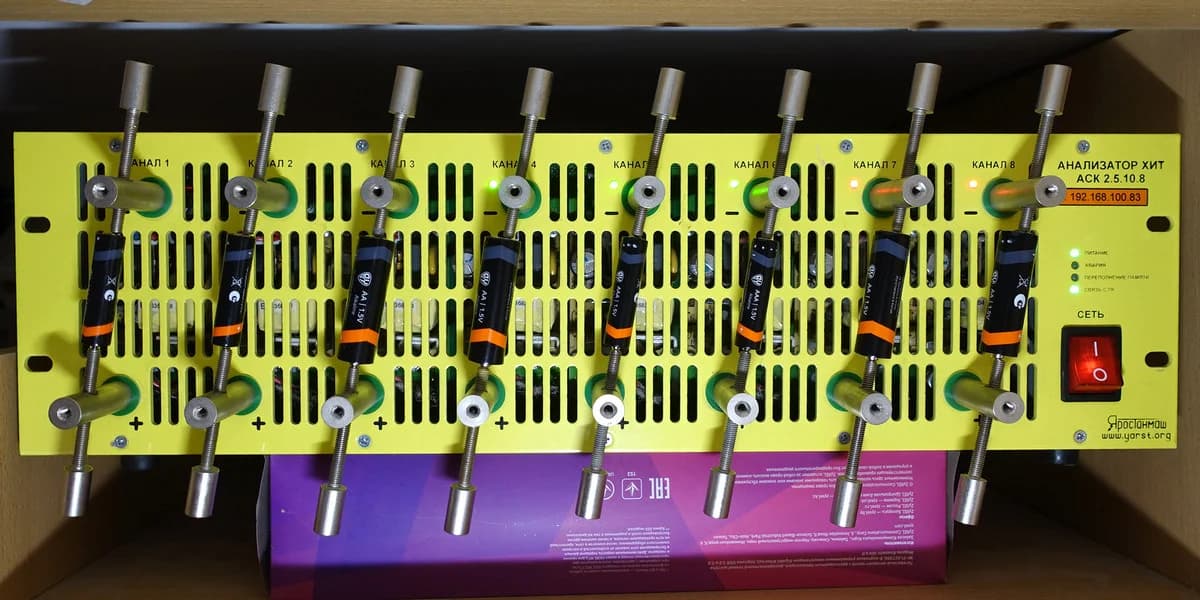 Емкость батареек измерялась с помощью анализатора химических источников тока Яростанмаш АСК2.5.10.8.