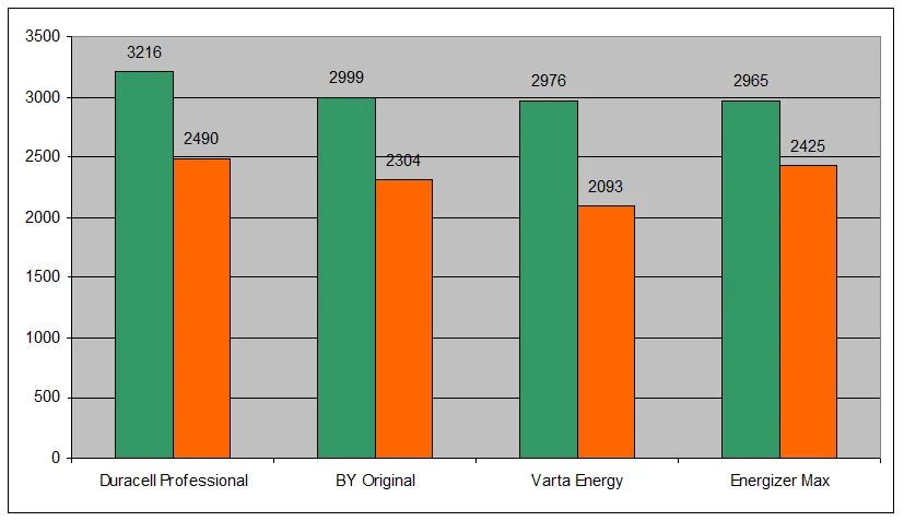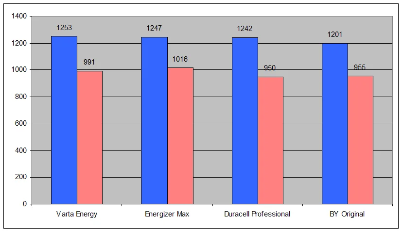 Батарейки BY Original AA опередили по емкости Varta и Energizer и отстали от Duracell на 7%. Нагрузочная способность у BY выше, чем у Varta, но чуть ниже, чем у Duracell и Energizer.