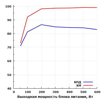 Эффективность БП находится на относительно невысоком уровне. Согласно нашим измерениям, КПД данного блока питания достигает значения свыше 84% в диапазоне мощности от 200 до 500 ватт, максимальное зарегистрированное значение составило 86,6% на мощности 200 Вт. КПД на мощности 50 Вт составил около 71%.