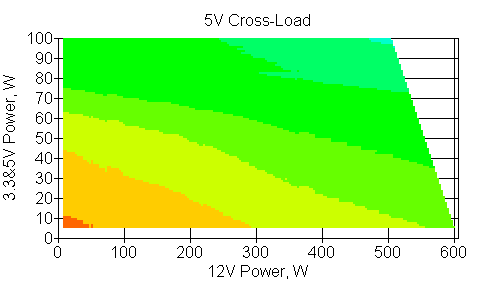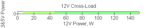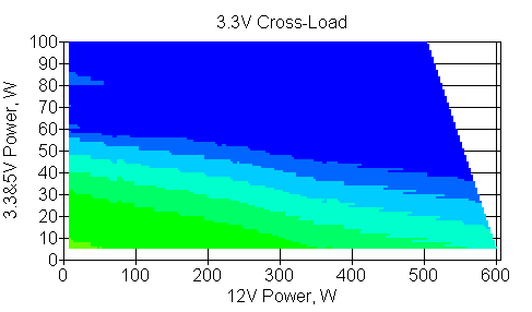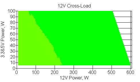 Следующим этапом инструментального тестирования является построение кросснагрузочной характеристики (КНХ) и представление ее на четвертьплоскости, ограниченной максимальной мощностью по шине 3,3&5 В с одной стороны (по оси ординат) и максимальной мощностью по шине 12 В с другой (по оси абсцисс). В каждой точке измеренное значение напряжения обозначается цветовым маркером в зависимости от отклонения от номинального значения.