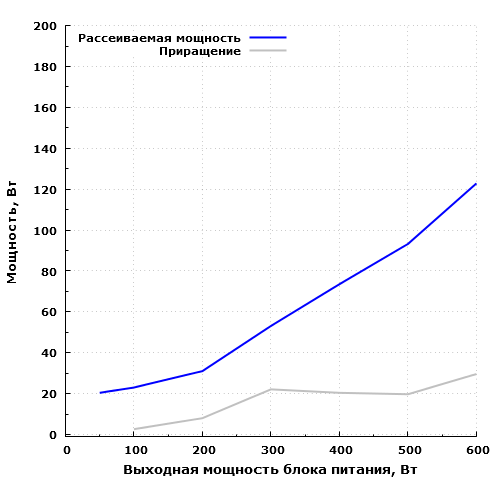 На максимальной мощности блок питания рассеивает около 123 Вт, на мощности 50 Вт — около 20,4 Вт. 60 Вт он рассеивает на мощности около 330 Вт, а 100 Вт — примерно на 520 Вт. Таким образом, экономичность можно считать удовлетворительной.