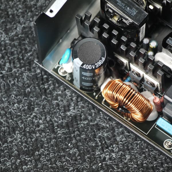 Основные полупроводниковые элементы установлены на двух компактных радиаторах с небольшим оребрением. Независимые источники +3.3VDC и 5VDC установлены на дочерней печатной плате и, по традиции, дополнительных теплоотводов не имеют — это вполне типично для блоков питания с активным охлаждением.
