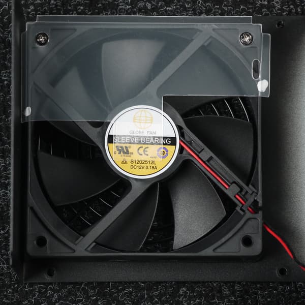 Под проволочной решеткой установлен вентилятор S1202512L типоразмера 120 мм производства Globe Fan. Данная модель вентилятора основана на подшипнике скольжения и имеет максимальную скорость вращения 2000 об/мин.