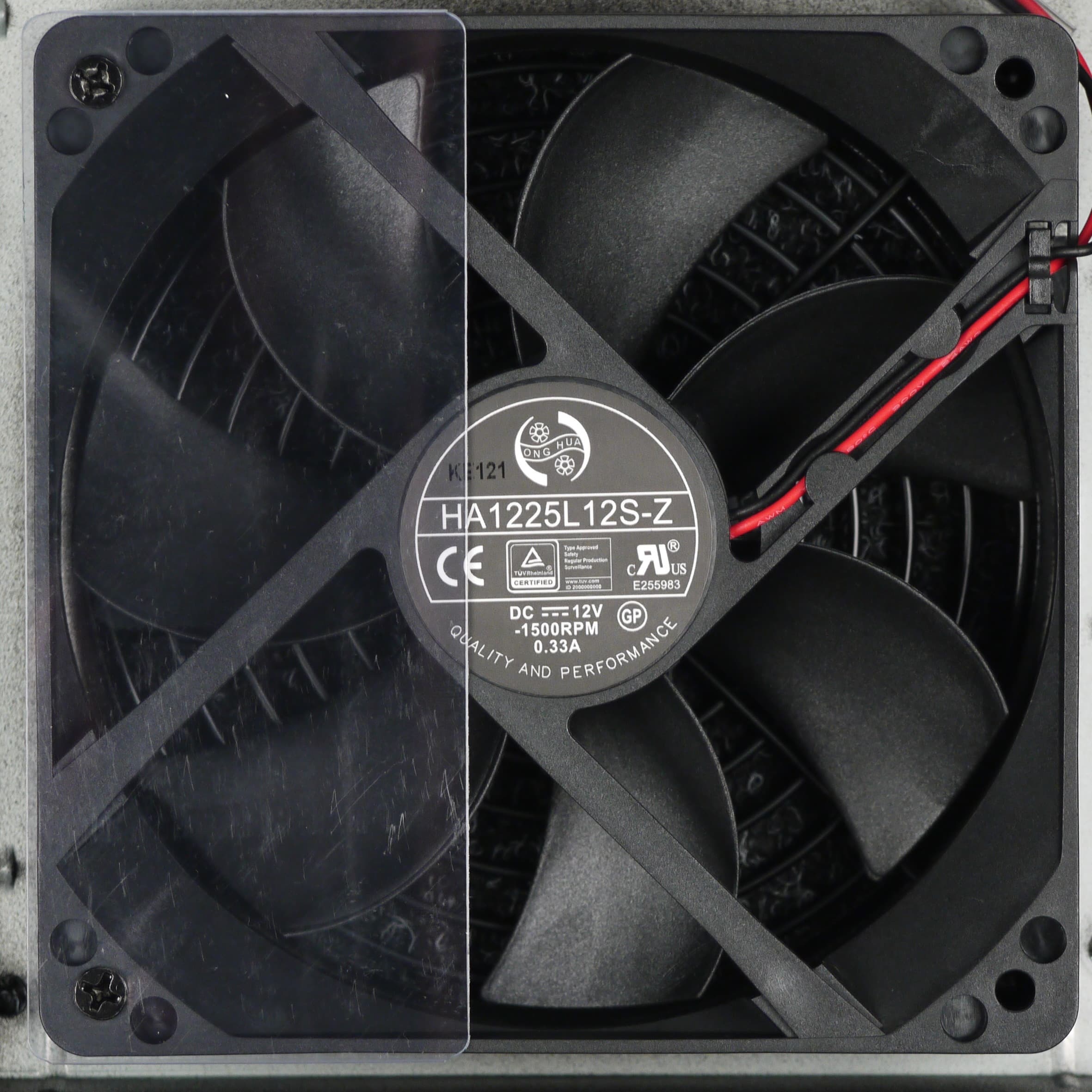 В блоке питания установлен вентилятор Honghua HA1225L12S-Z типоразмера 120 мм. Вентилятор основан на подшипнике скольжения и имеет скорость вращения 1500 об/мин, согласно данным производителя. Подключение двухпроводное через разъем.