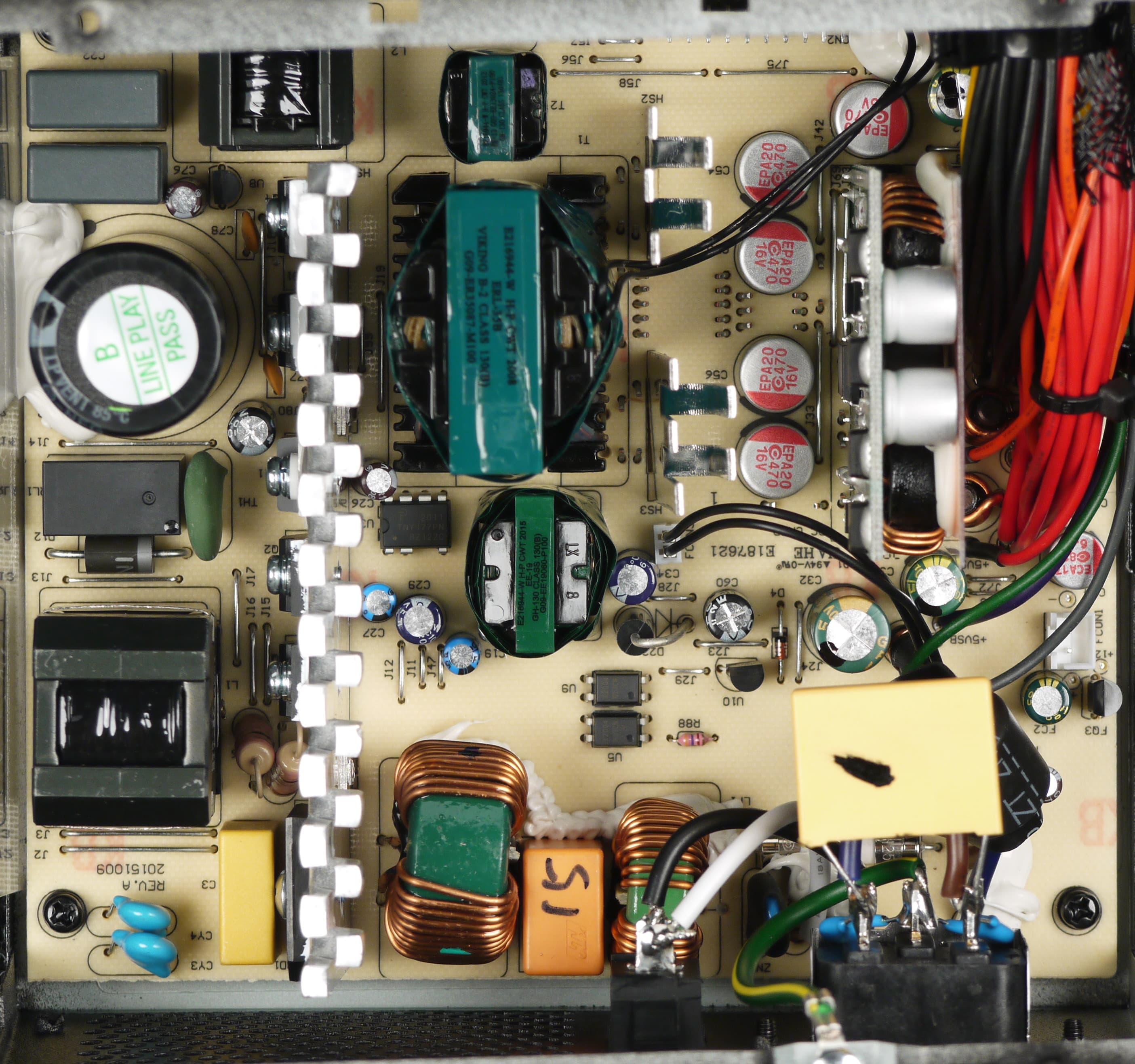 Блок питания оснащен активным корректором коэффициента мощности, дроссель которого упакован в пластиковый корпус в открытом исполнении. Источник питания рассчитан на работу в электросетях с номинальным напряжением от 100 до 240 вольт, то есть имеет расширенный диапазон питающих напряжений. Это может оказаться полезным при работе от сети, в которой имеются значительные отклонения от номинальных значений напряжения.
