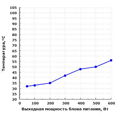 При дальнейшем увеличении выходной мощности уровень шума блока питания заметно повышается и при работе на максимальной мощности превышает значение в 40 дБА при условии настольного размещения, то есть при расположении блока питания в ближнем поле по отношению к пользователю. Подобный уровень шума можно охарактеризовать как достаточно высокий.