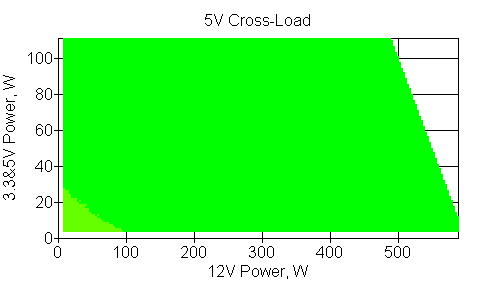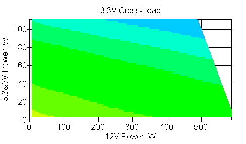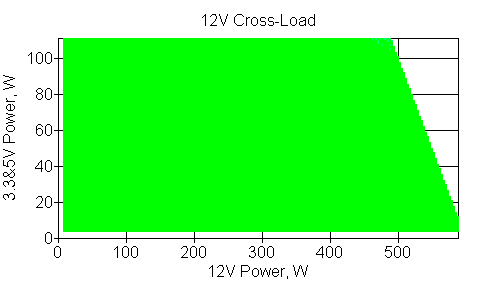 Следующим этапом инструментального тестирования является построение кросснагрузочной характеристики (КНХ) и представление ее на четвертьплоскости, ограниченной максимальной мощностью по шине 3,3&5 В с одной стороны (по оси ординат) и максимальной мощностью по шине 12 В с другой (по оси абсцисс). В каждой точке измеренное значение напряжения обозначается цветовым маркером в зависимости от отклонения от номинального значения.