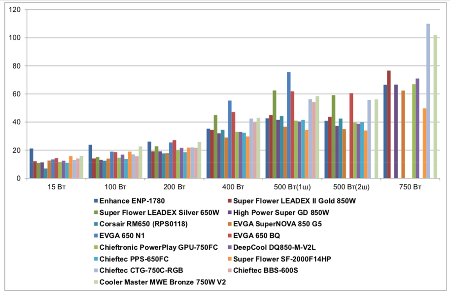 | Super Flower Leadex Silver 650W | 10,9 | 15,1 | 22,8 | 45 | 62,5 | 59,2 | |