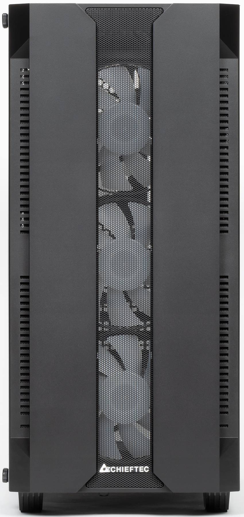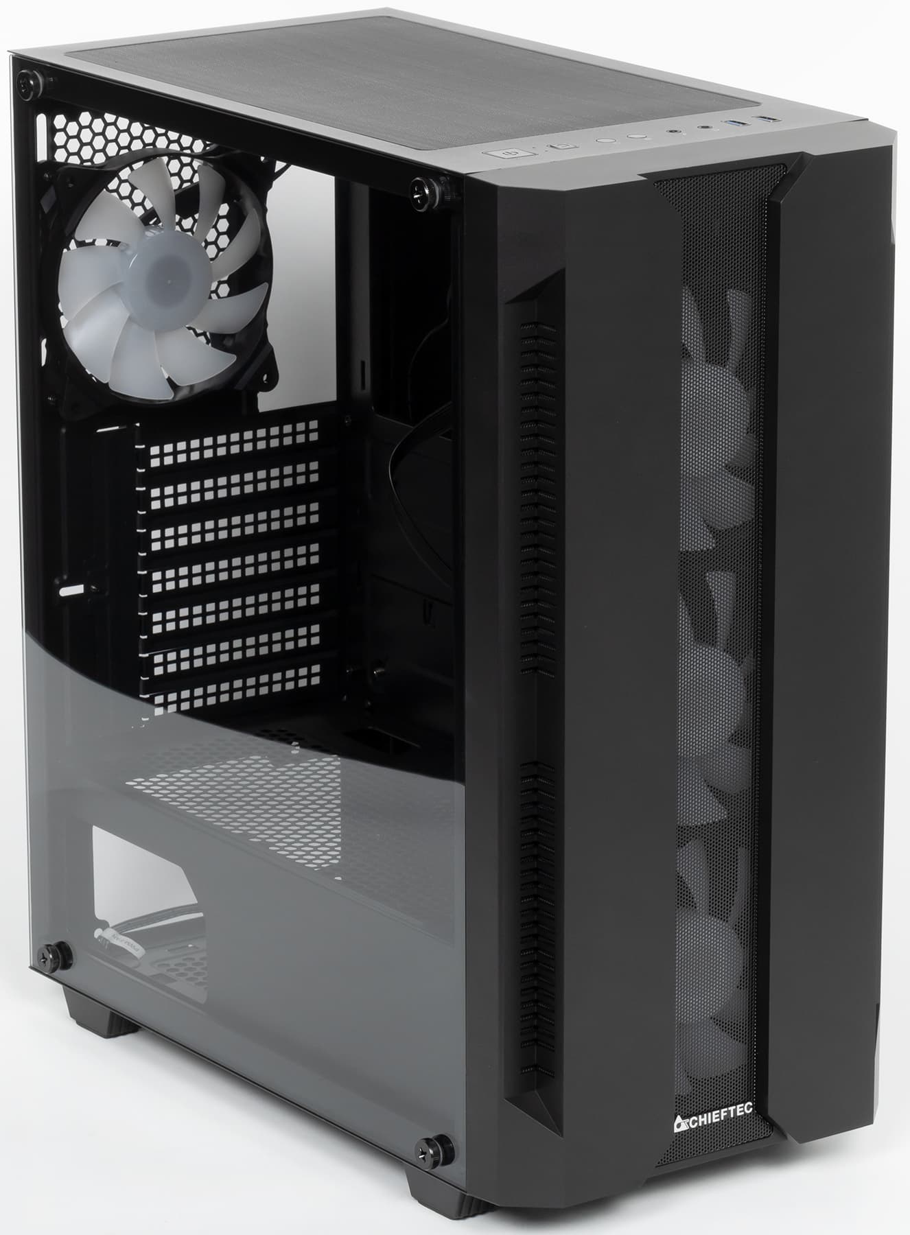 Chieftec Hunter (GS-01B-OP) — это новая бюджетная модель бренда с ориентировочной стоимостью 4,5-5 тысяч рублей на момент подготовки обзора. Передняя панель корпуса закрыта сеткой, но не целиком, а только в центральной части, тогда как по бокам выступают плоские накладки. Дизайн смотрится неплохо, хоть и простенько. Все остальное — в полном согласии с современными трендами: левая боковая стенка стеклянная, вентиляторы с подсветкой, управляемой многофункциональным контроллером, который регулирует еще и скорость вращения вентиляторов.