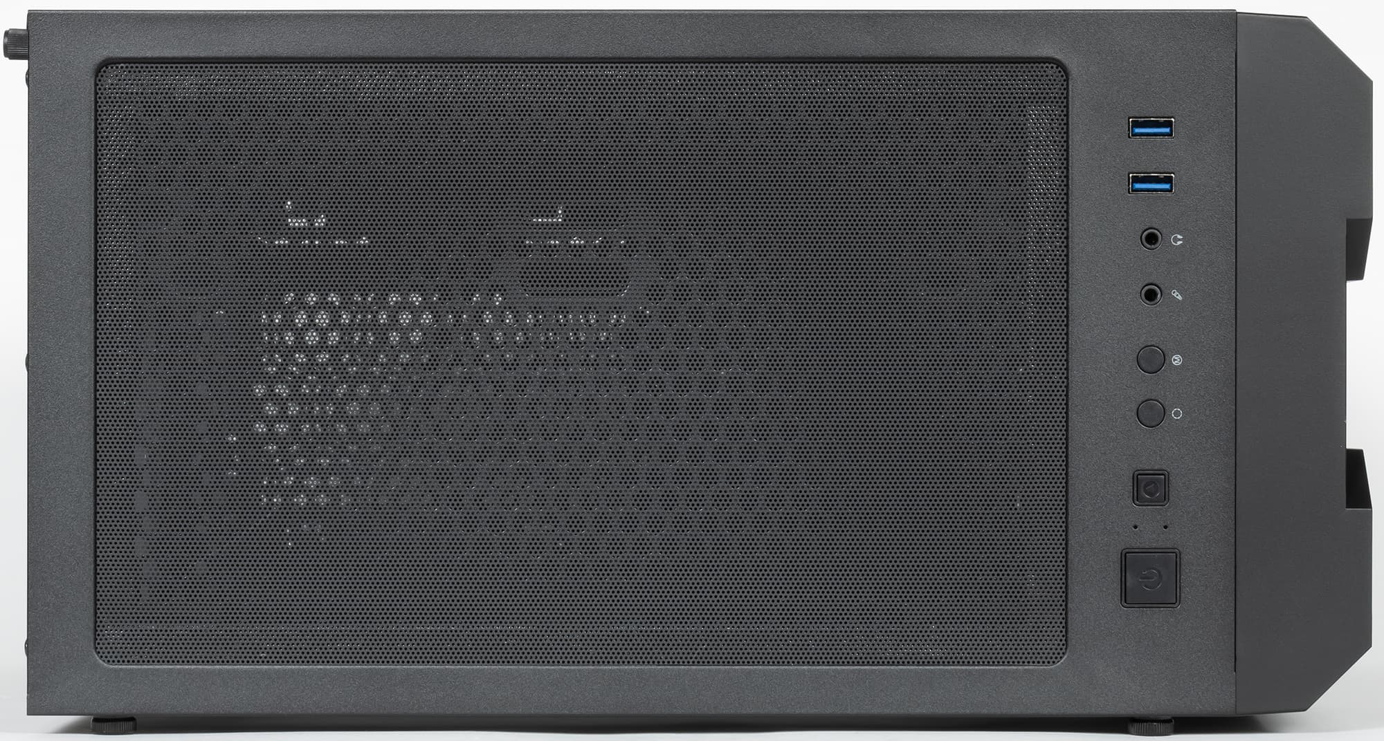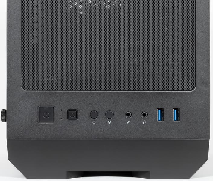 В передней части верхней панели размещены органы управления и коммутации. В их состав входят: два разнесенных друг от друга примерно на 8 мм порта USB 3.0, стандартные разъемы для подключения микрофона и наушников, большая квадратная кнопка включения и кнопка перезагрузки. Кнопки располагаются рядом, но отличаются размерами. Также присутствуют две кнопки управления подсветкой. Индикатор включения — голубого цвета и довольно яркий, но поскольку он утоплен внутрь, то особых неудобств это не доставляет. Индикатор активности накопителей — красного цвета.