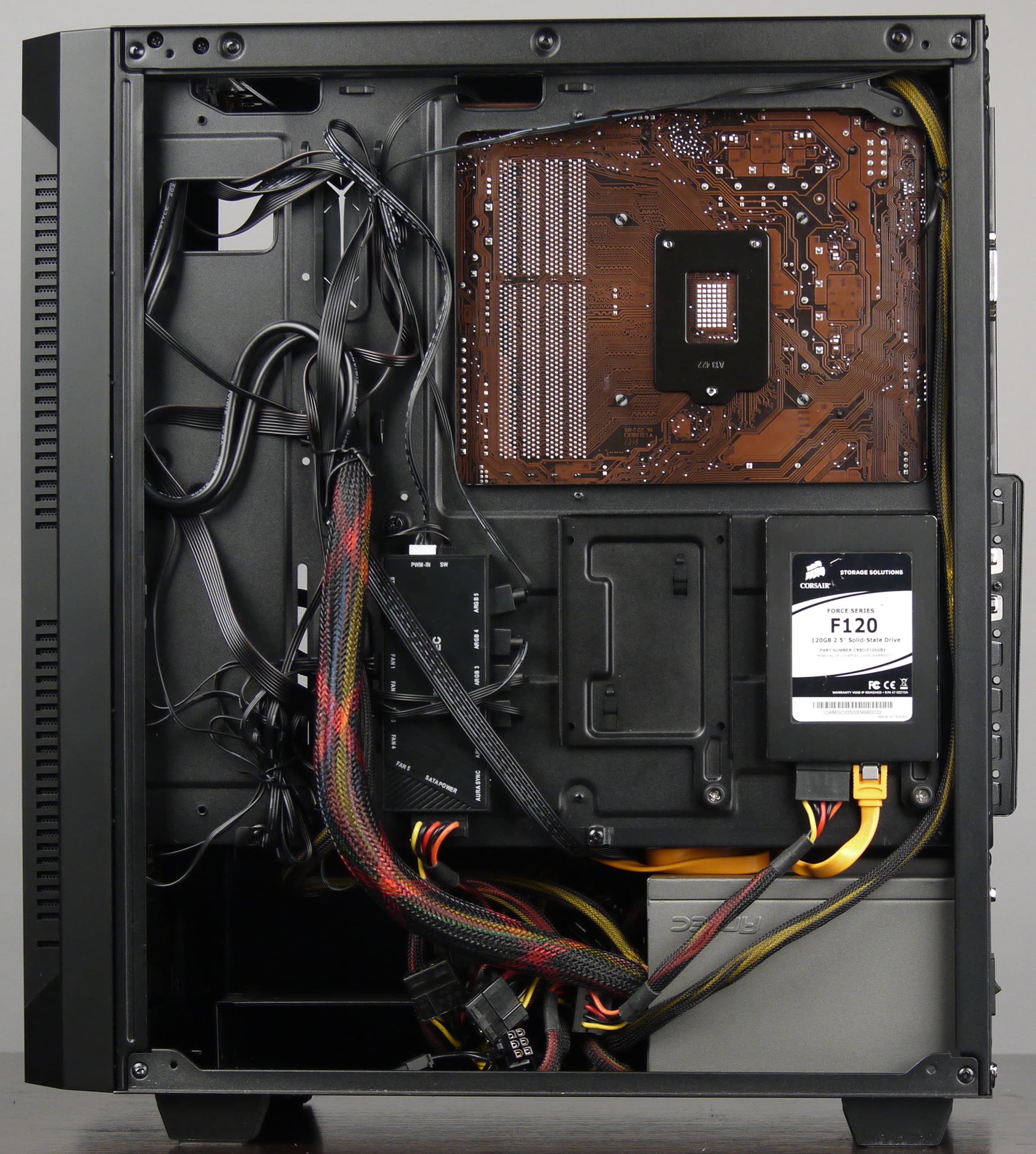 Корпус предусматривает установку блоков питания стандартных размеров: расстояние между задней панелью корпуса и корзиной составляет около 220 мм. Мы рекомендуем выбирать БП с длиной корпуса не более 170 мм, так как в этом случае останется больше места для укладки проводов.