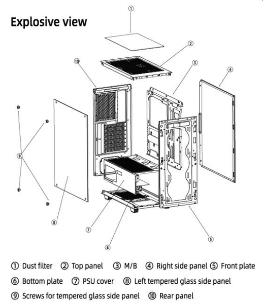 Корпус представляет собой решение башенного типа с вертикально размещаемой платой формата ATX (и менее габаритной) и горизонтальным расположением блока питания снизу. Кожух закрывает место установки блока питания со стороны левой стенки, придавая внутреннему виду корпуса аккуратность и законченность. Также кожух исполняет роль своеобразного элемента жесткости, который обеспечивает дополнительную фиксацию основания для системной платы с нижней стороны.