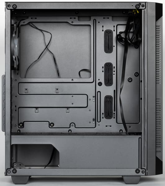 Компоновочные решения данной модели определяются современными тенденциями корпусостроения. В данном случае разработчики отказались от отсека для устройств формата 5,25″, а привычный отсек для устройств 3,5″ расположен около передней стенки шасси, но присутствует он в усеченном виде — всего на два диска.