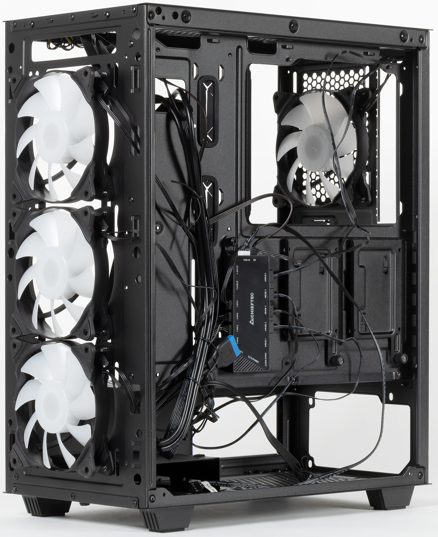 В качестве источника света в корпусе применены вентиляторы типоразмера 120 мм с индивидуальной адресацией светодиодов: три установлены спереди, еще один — сзади. Они подключаются ко встроенному контроллеру при помощи стандартных разъемов типа ARGB с колодкой 1×4 для управления подсветкой и стандартных трехконтактных разъемов с управлением питающим напряжением.