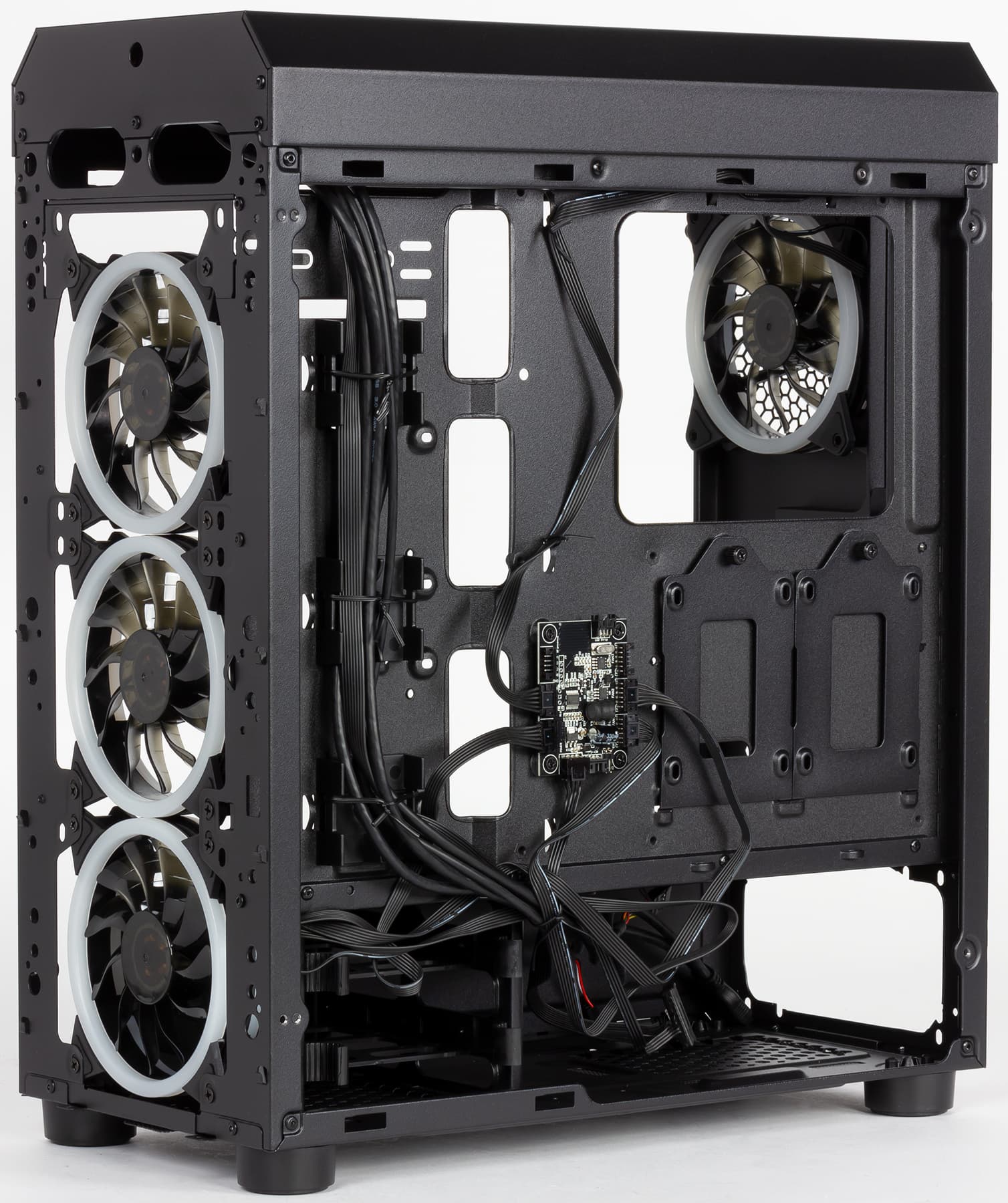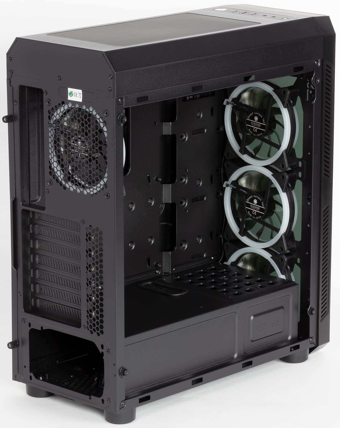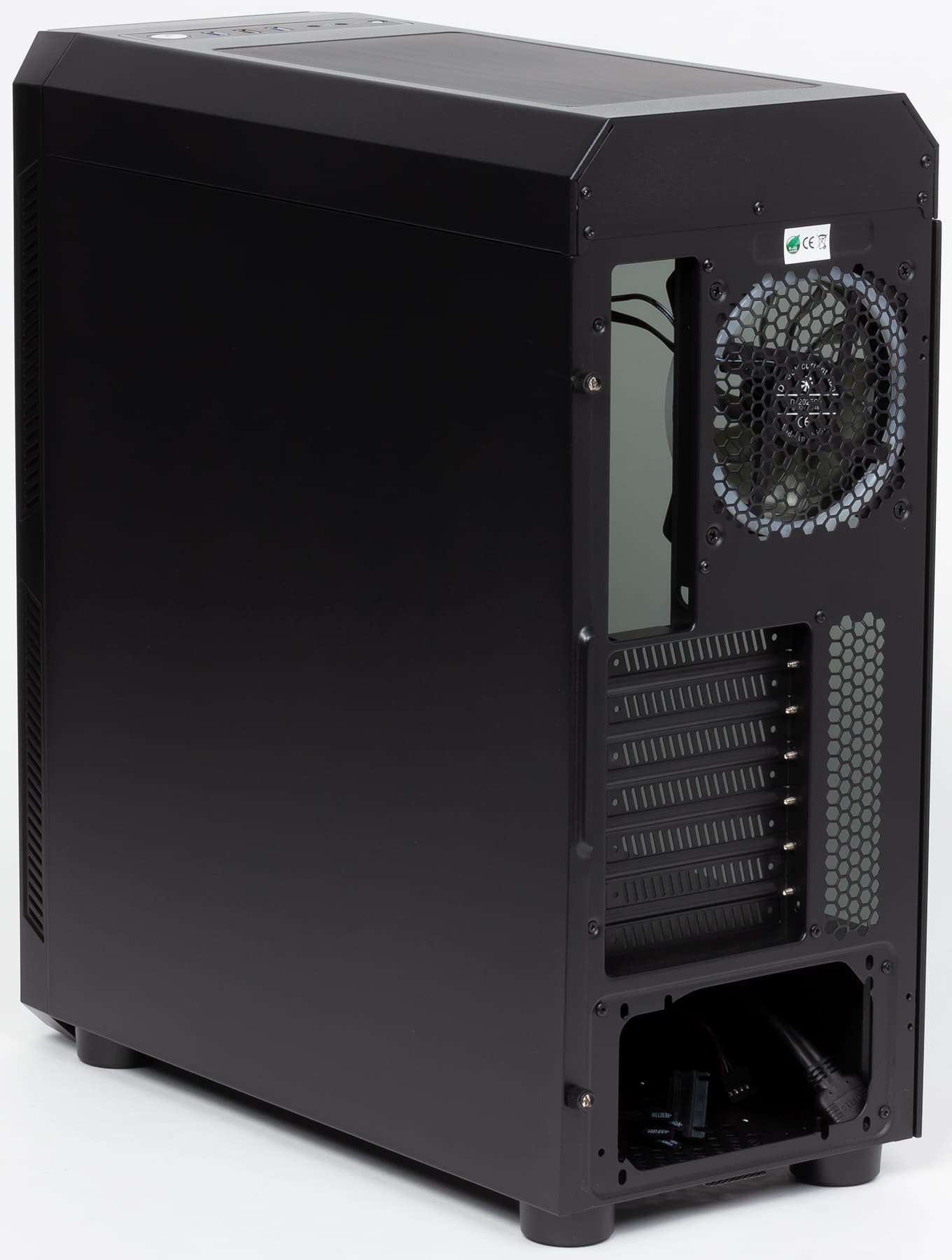 Во внутреннем объеме корпуса стальная Г-образная перегородка отделяет отсек для блока питания. Эта перегородка занимает почти всю длину от передней до задней стенки, оставляя лишь небольшое расстояние для нижнего фронтального вентилятора.