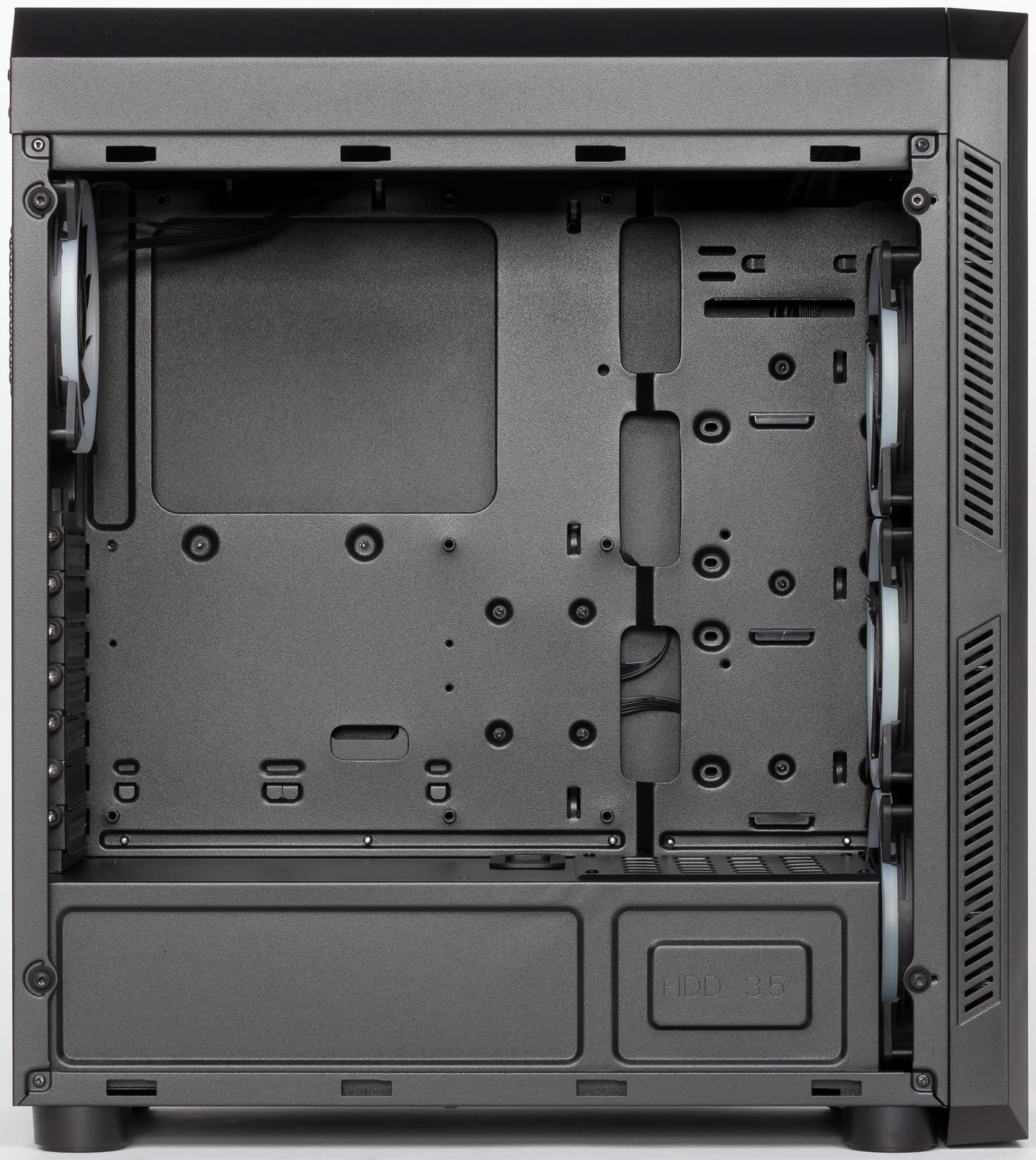 На днище шасси есть отверстия в месте расположения блока питания, размер перфорированной области вполне достаточный для БП длиной 140-180 мм. Боковые стенки (и левая стеклянная, и правая металлическая) сплошные, размещение вентиляторов на них невозможно.