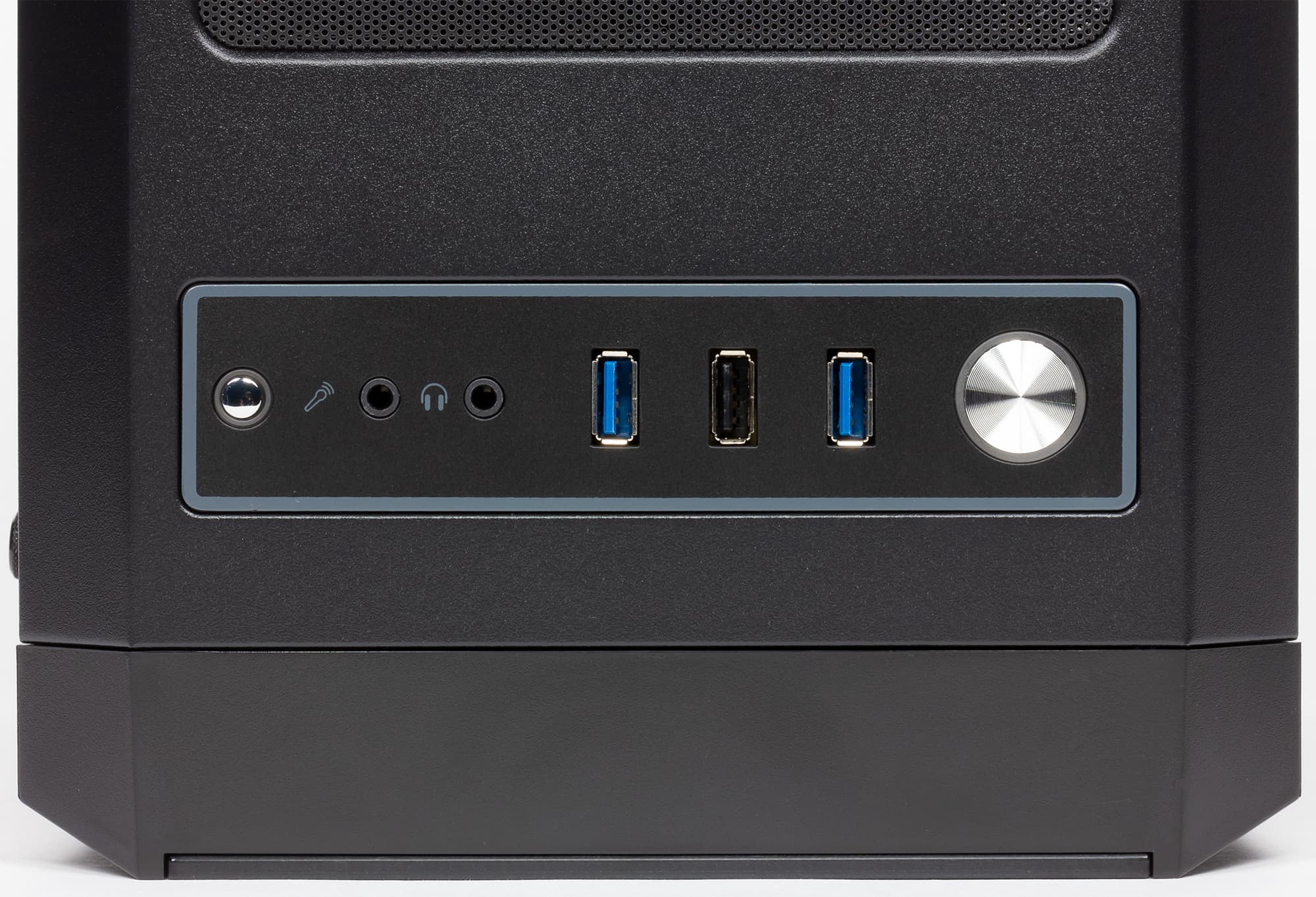 Содержимое панели управления расположено в один ряд: справа крупная кнопка Power в виде алюминиевого диска, имеющего обрамляющую подсветку белого цвета, затем порты — два USB 3.0 и между ними один USB 2.0 (все с соответствующей цветовой маркировкой). Разъемы ориентированы не в одну линию, а параллельно, зазор между ними составляет 11 мм, поэтому возможны проблемы при одновременном подключении широких устройств в соседние порты.