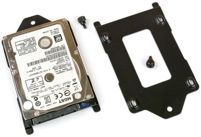 3,5-дюймовые накопители в них фиксируются пластиковыми выступами, входящими в боковые отверстия корпуса диска, возможна дополнительная фиксация винтами, четырьмя снизу или двумя по бокам; каких-либо амортизаторов нет. 2,5-дюймовые SSD/HDD крепятся четырьмя винтами снизу.