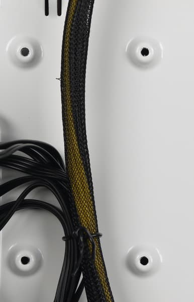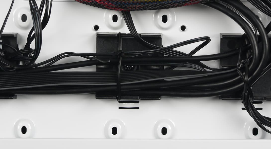 Для монтажа проводов предусмотрены петли для крепления стяжек или других аналогичных изделий, а также некое подобие кабельного лотка, который сформирован при помощи нескольких пластиковых скоб П-образной формы, установленных при помощи винтового крепления. В монтажных отверстиях лепестковые мембраны отсутствуют за исключением одного монтажного отверстия на кожухе блока питания — там мембрана есть, причем черного цвета.