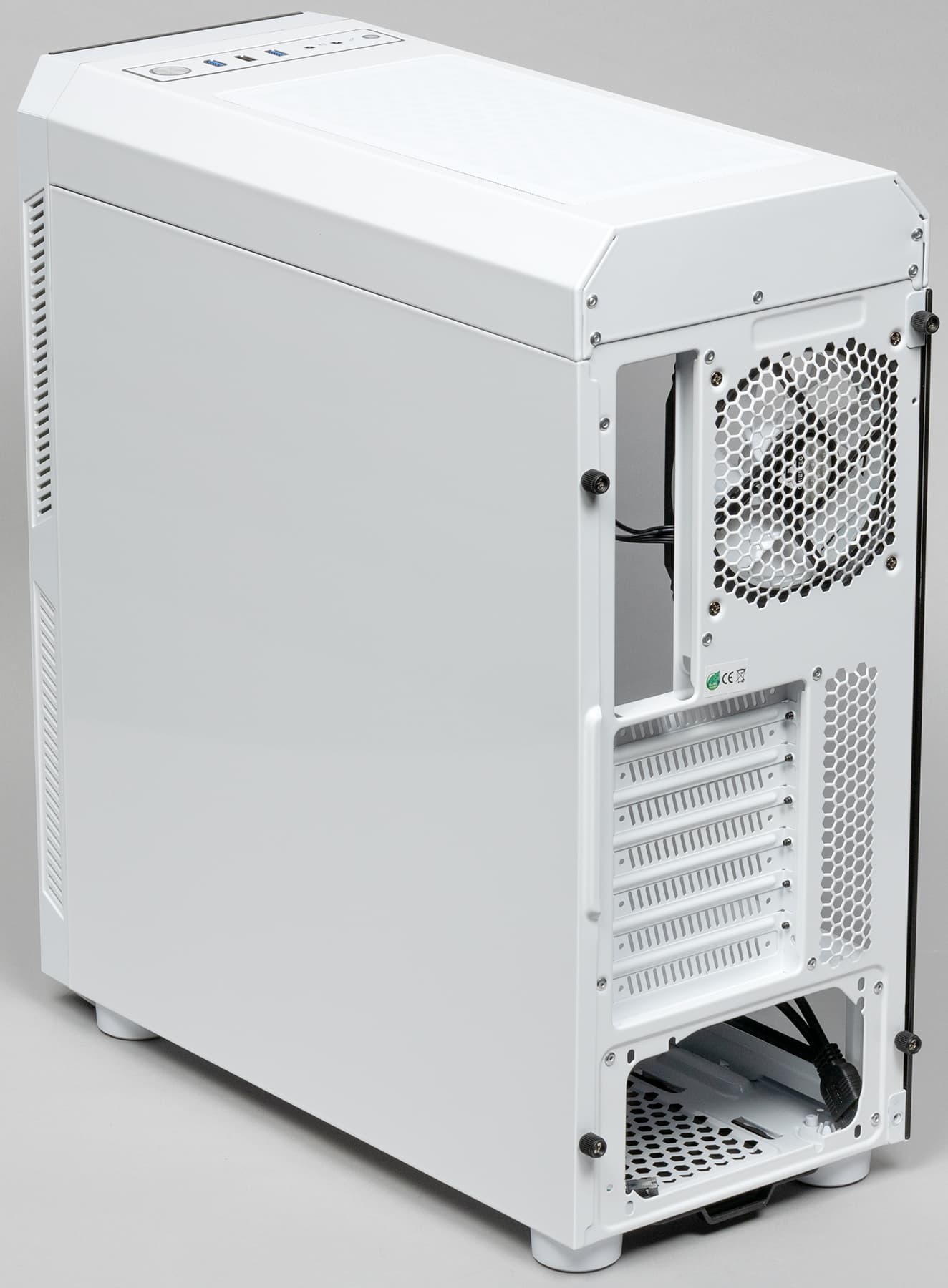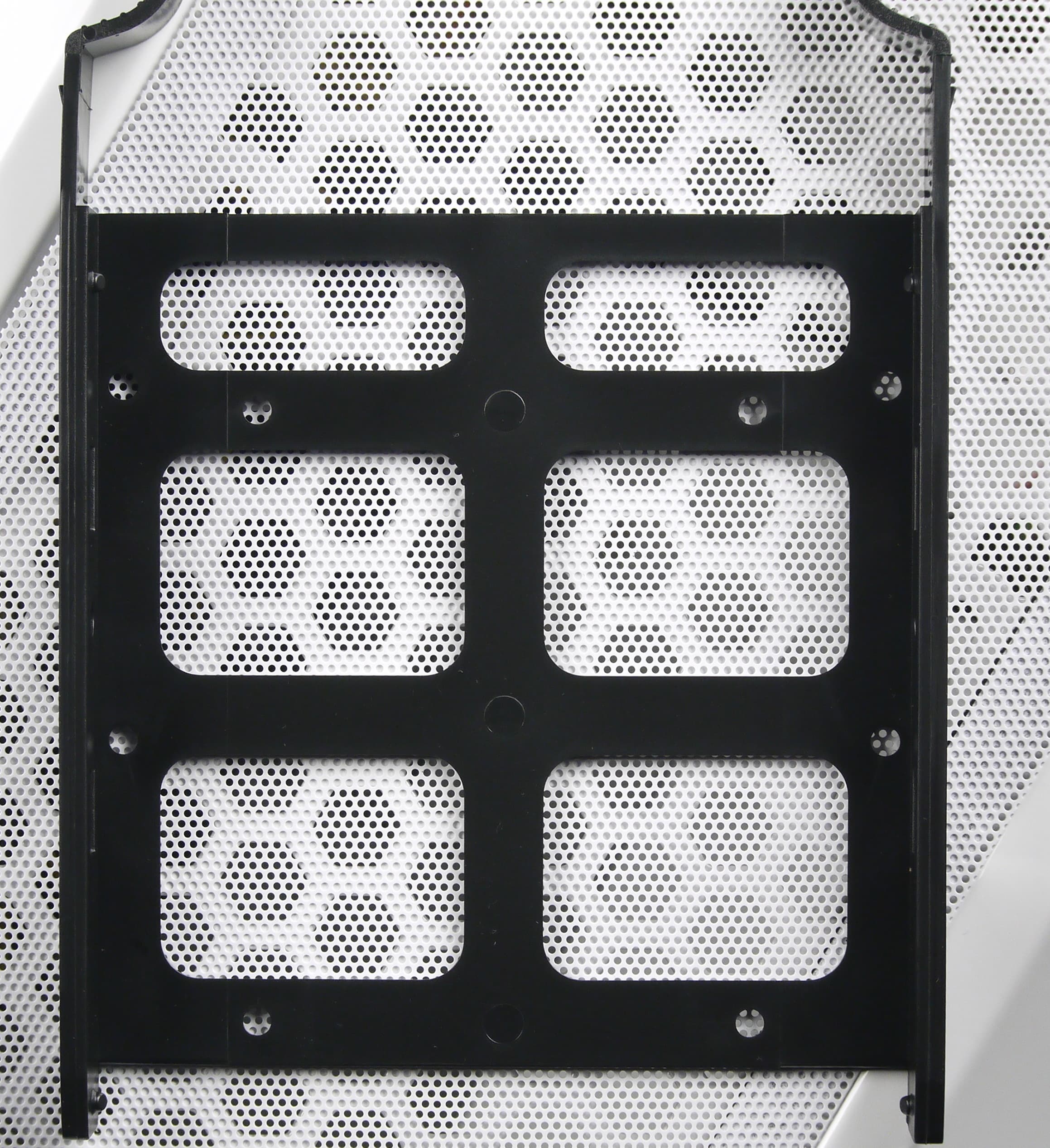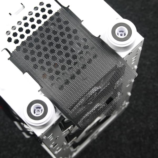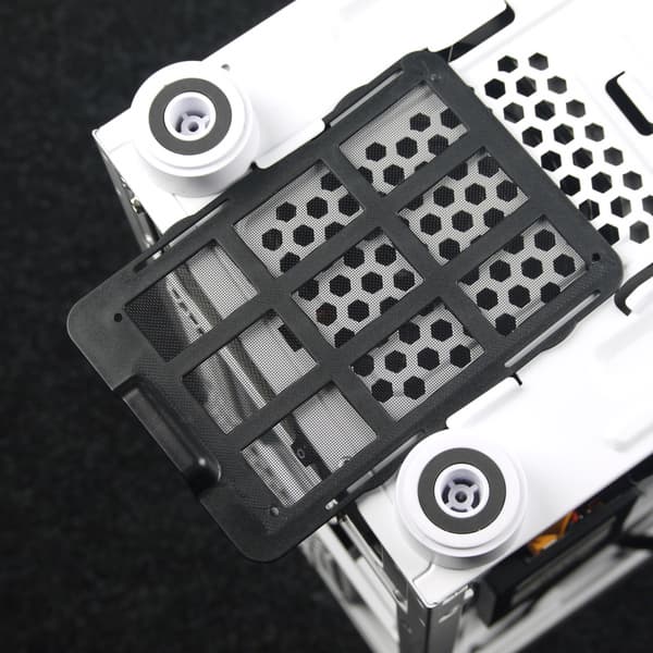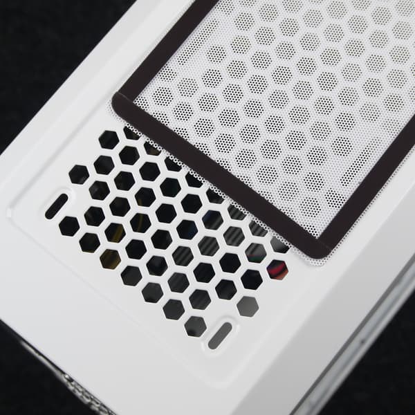 Верхняя панель выполнена из стали, в ней имеется вентиляционная решетка, которую закрывает сверху фильтр. Верхняя панель приклепана к шасси, причем формой она напоминает корыто, что позволяет размещать под ней вентиляторы или системы СЖО типа AIO без конфликта с системной платой, так как внутреннее расстояние между верхним краем системной платы и плоскостью стенки составляет около 65 мм.
