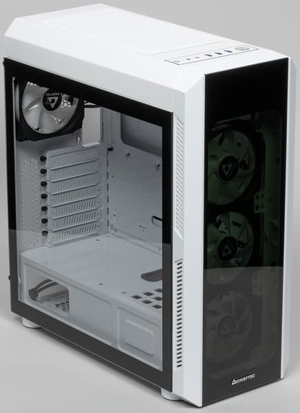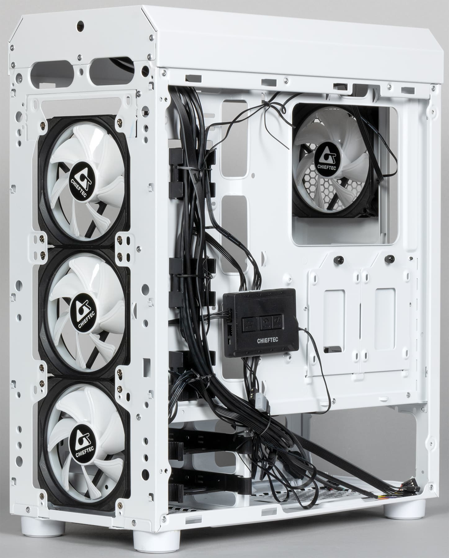 У данной модели корпуса две стеклянные панели: спереди и слева. Предустановлены вентиляторы с ARGB-подсветкой и штатный контроллер управления вентиляторами с ПДУ.